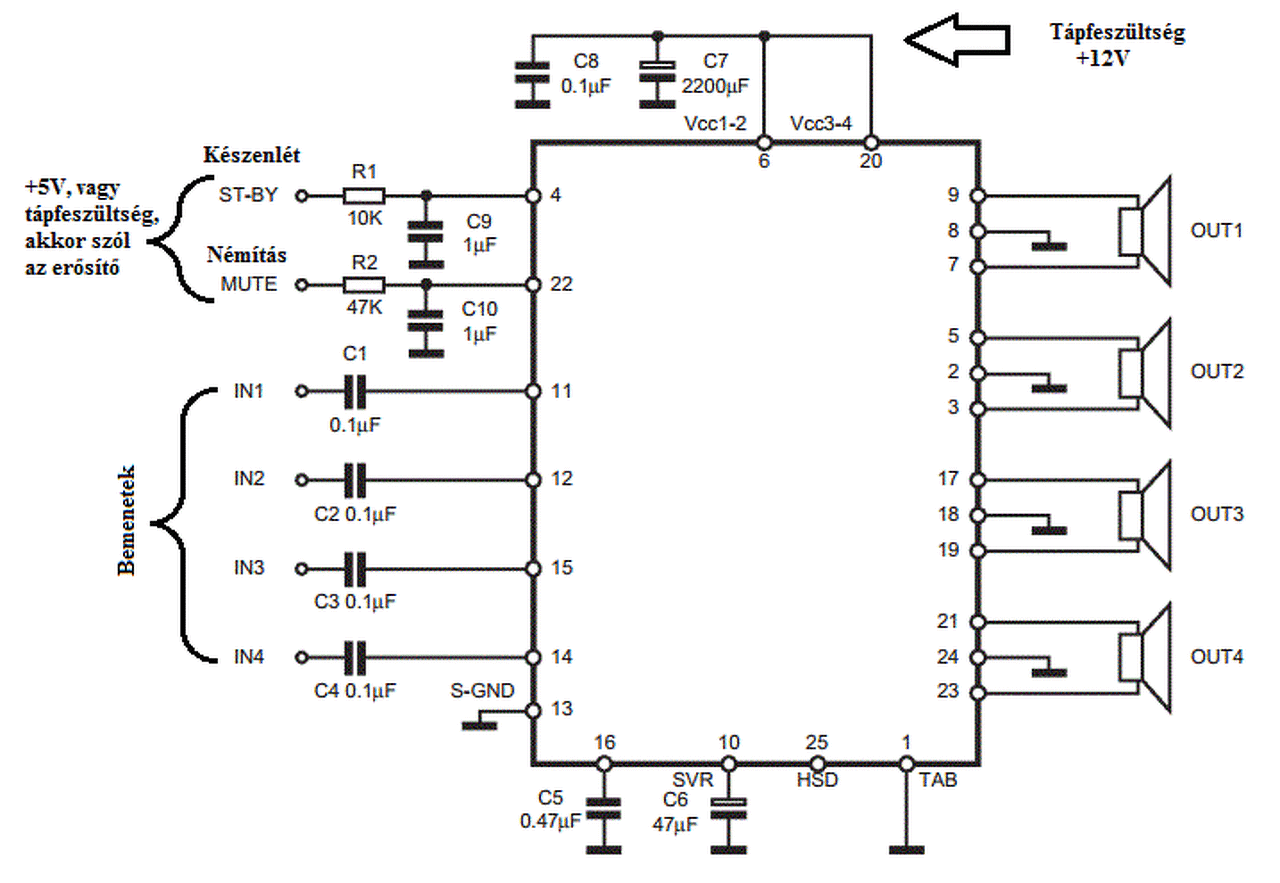 A TDA7384 áramkörileg megegyezik a TDA7386-tal, van külön témája. Az ott leírtakat hasznosíthatod. A rajzára ráírtam a bekötési pontokat.