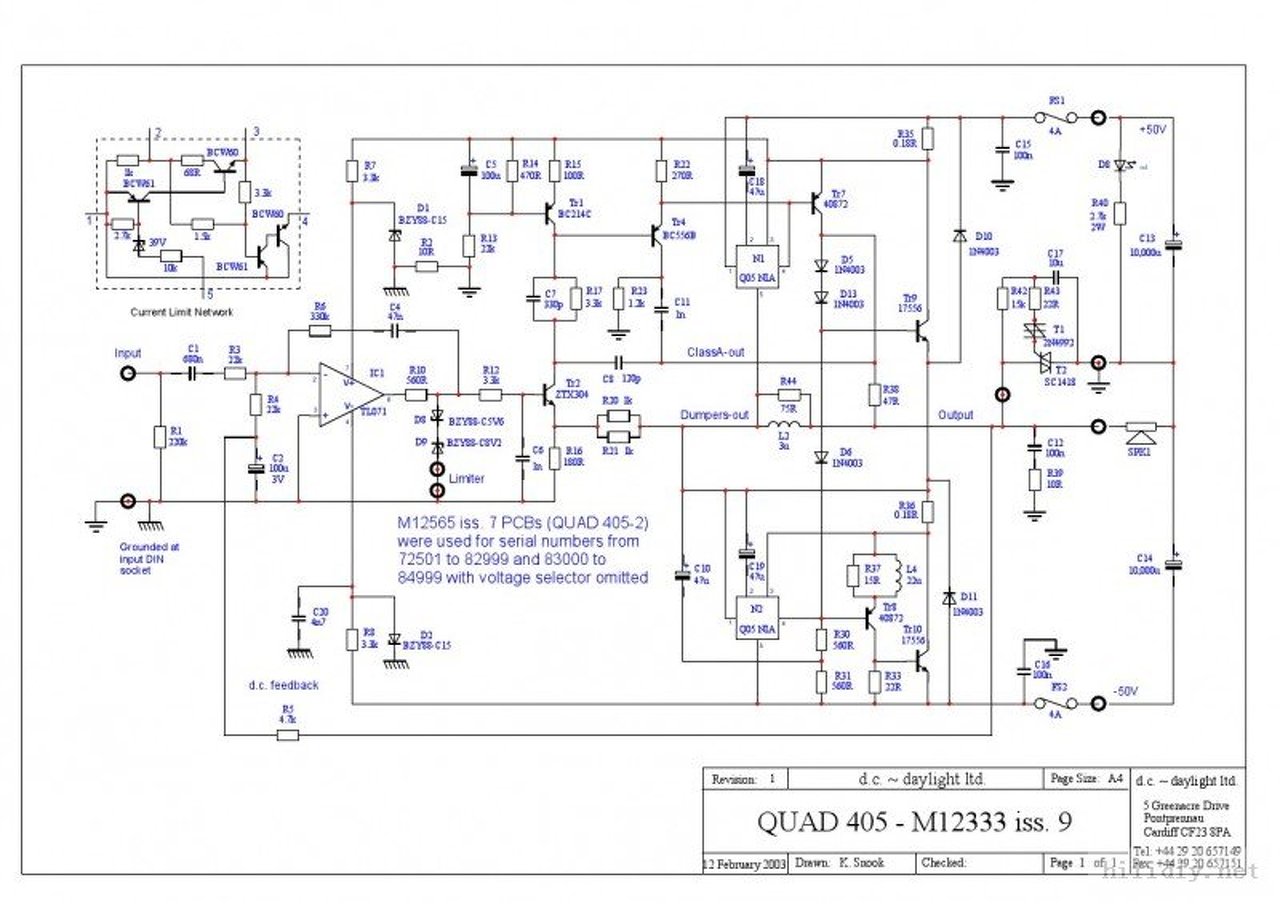 kedves 200wattosok! Ahhoz képest hogy egy első szériás panel megépítve -limiter nélkül- simán hoz 30Veffektív-et 4 ohm-on 225W 0.02%-os torzítással, van tartalék bőven. Egyébként ajánlom a 405-2 széria áram limiterét elemezni, és használni, nem gerjedékeny, és lehet a töréspontot a 3.3kohm és az 1.5kohm ellenállásokkal változtatni. http://www.audio-occasion.qc.ca/pdf/manuels/Quad405_ang.pdf amit érdemes nézegetni a 10 oldal limiter görbéje (fekete görbe). (a fesz limiter az IC kimenetén van (50W)(szaggtott vonal)). ( a rajz egy utolsó szériából való) üdv!