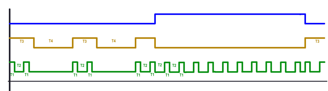 Adott egy astabil T1 és T2 periódusidőkkel. T1: kb 0,3 - 2 másodperc T2: kb. 20 - 180 másodperc. Ezt a billegő áramkört két dolog hozhatja működésbe. 1. Egy külső kapcsolójel magas szintje. 2. Egy másik astabil kimenőjelének magas szintjének a megléte (vagyis addig amíg a kimenet magas szinten van) A második astabil (álljon T3 és T4 periódusidőkből, hogy ne legyen keveredés) T3: kb 3 perctől - 10 percig T4: 30 perctől 3 óráig Rajzoltam valami folyamatábrának csúfolandó skiccet. Az időarányok kicsit torzak, mert ekkora időátfogásokat egy rajzon nehéz lett volna arányosan megrajzolni, de talán látható rajta mit is szeretnék. Röviden összefoglalva, bekapcsolom az egész áramkört, ha van külső vezérlőjel, akkor T1-T2 astabil induljon. T3-T4 addig áll, amíg a vezérlőjel meg nem szűnik. Ekkor ugye megszakad a T1-T2 tápja és T3-T4 indul. Amikor ennek kimenete H szinten van, akkor az kapcsolja be T1-T2 - t. Tudom, hogy most a vérbeliek a fejüket fogják, mert ez már mikrovezérlős kategória (is lehetne), de 4 időzítős áramkört inkább bevállalnék Köszönöm, ha valaki segít ebben.
