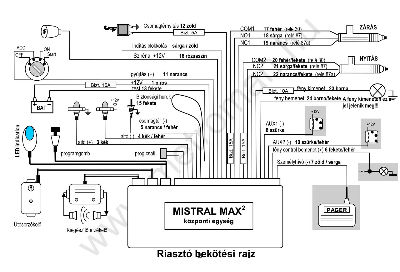 Tegnap szereltem be egy autóriasztót(mistral maxR2),központi zárral együtt(csak motorok mivel a riasztón van közonti zár vezérlés).A motorokat a jobb oldali bekötési ábra alapján kötöttem be,jol működik csak az a gond hogy az első ajtókban 5 vezetékes motorok vannak és a követő funkció így nem működik (nem lehet kulccsal nyitni az összes ajtót.) Arra gondoltam hogy valami kis relés kapcsolással meg lehetne oldani ezt? A szabványos motorok vezetékei KÉK-ZÖLD motor vezérlés (polaritás fordítással) ezek vannak bekötve a riasztóhoz a jobb oldali bekötési ábra alapján. De van még BARNA-FEKETE-FEHÉR. vezeték is Annyit ki tudtam hámozni hogy,közös pont a FEKETE,a végállások pedig a BARNA/FEHÉR Továbbá,számomra nem nagyon világos hogy lehetne normálisan bekötni a vészvillogót mivel autóm vészvillogója nem hagyományos kapcsolós,záróérintkezős hanem nyomógomb szerű impulzus vezérelt.Ha a lenti ábra alapján kötöm be,össze vissza villogtatja a helyzetjelzőt,sőt élesített állapotban állandóan villog, nem kapcsol ki egy idő után.Talán egy relét kellene közbe iktatni? Ennek megoldásához szeretnék segítséget kérni. Köszönettel.... Idézet: „csak motorok mivel a riasztón van közonti zár vezérlés” Ne hívjuk annak. Tudja közvetlenül kapcsolni a motorokat, vagy egy bármilyen kp zár vezérlőt. Idézet: „nem lehet kulccsal nyitni az összes ajtót” Ehhez kell a kp zár vezérlő. Pl. ez a Fiat Uno-ból visszarajzolt. Ennél egyszerűbb nincs, vagy vehetsz is egyet külön.