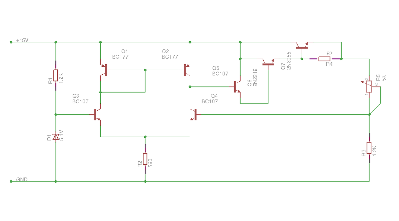 Igen, azóta módosítottam rajta(de még nem volt időm tesztelni), az R5 8K-s és az R3 5K-s. Ezeket frissen számoltam, azelőtt is módosítottam rajta, az R5 5K-s volt, az R3 3K-s. Azt vettem észre, hogy csak akkor működik megfelelően a feszültségosztó, ha úgy méretezem, hogy a maximális 13 voltra 5 volt jelenjen meg a kimenetén. Ez ugyanannyi kb. mint a zéner feszültsége, szóval azt következtettem, hogy úgy kell méretezni a feszültségosztót, hogy maximális kimeneti feszültségnél a referenciafeszültséget adja ki, mivel differenciálerősítővel szabályozom a végfokot. És a másik kérdés az, hogy milyen szabály szerint kell megválasztani az R4-hez hasonló ellenállásokat. Számít-e, hogy vezérlőtranzisztorhoz, vagy végfoktranzisztorhoz kell bekötnöm?