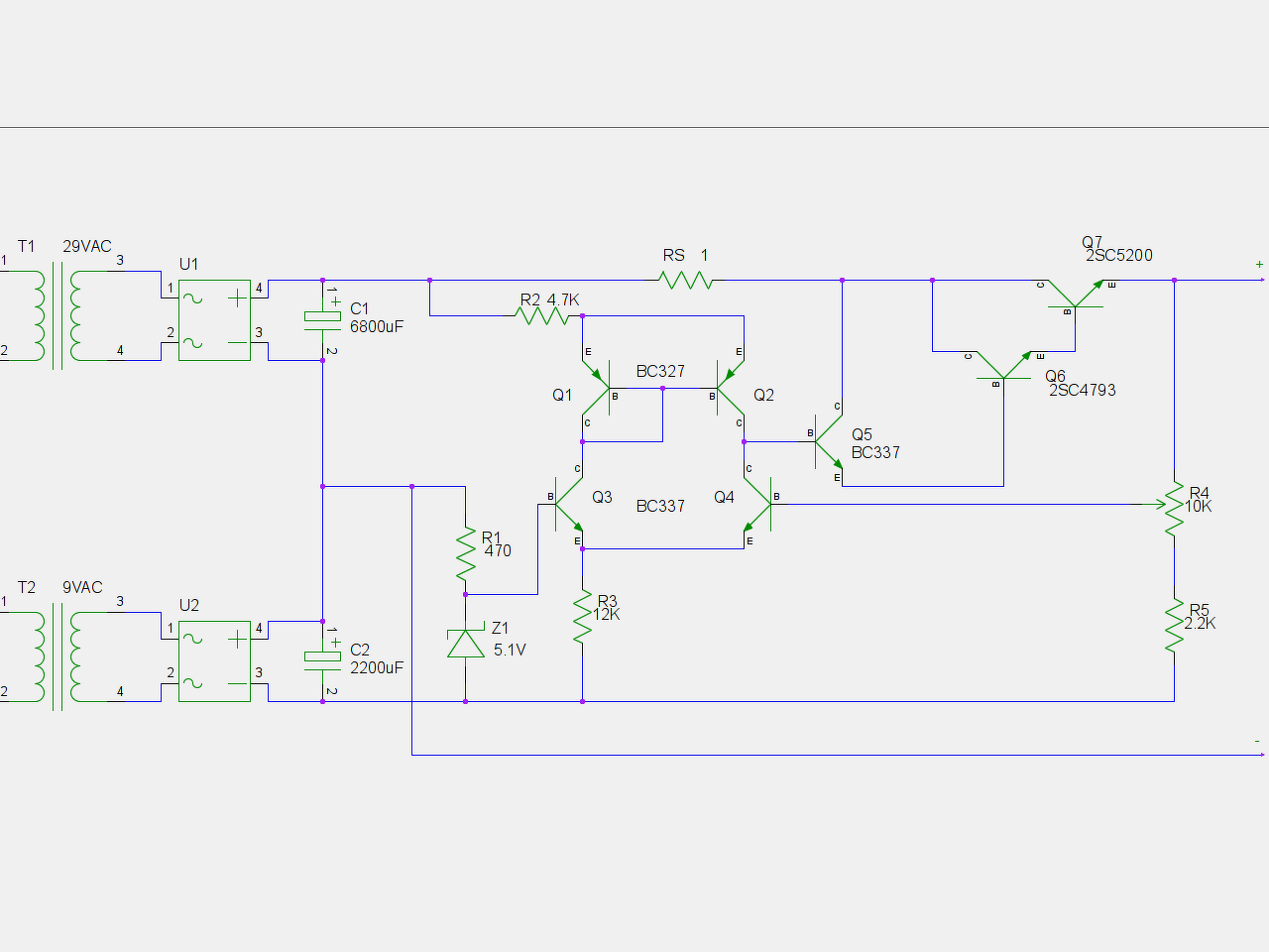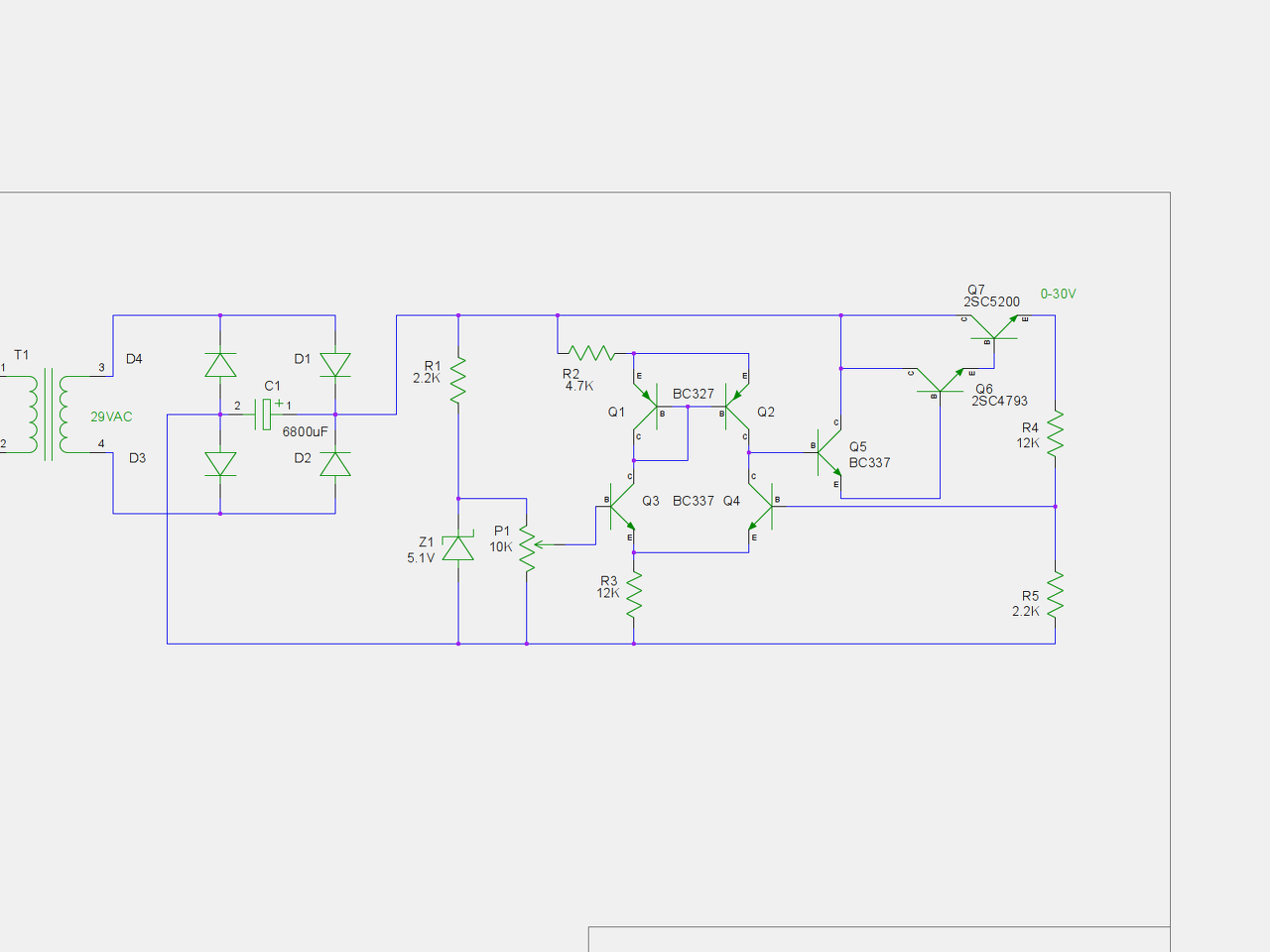 Sziasztok. Kísérletezek már egy jó ideje annak érdekében hogy meg tudjam építeni a legelső tápegységemet. Már pár kapcsolást végig nyálaztam, aztán mindegyikből tanultam valamit. Az eddigi eredmény mellékelve. 0-30 voltig megy a szabályzás és majd maximálisan 2 ampert szednék ki belőle. Azt szeretném megoldani, hogy tudjam szabályozni a fogyasztók által felvett áramot. Úgy, hogy le tudjon menni a szabályzás legalább 100mA-ig. Az elgondolás az, hogy differenciálerősítővel felerősítem a söntellenállás két sarkán mért feszültség különbségét. Ezzel kapcsolatosan szeretnék segítséget, tanácsot kérni. Tudom hogy vannak erre integrált áramkörök, de egyenlőre hanyagolnám azokat, mert a tápegység építésének egy másik célja a tanulás. Köszönöm előre is a segítséget