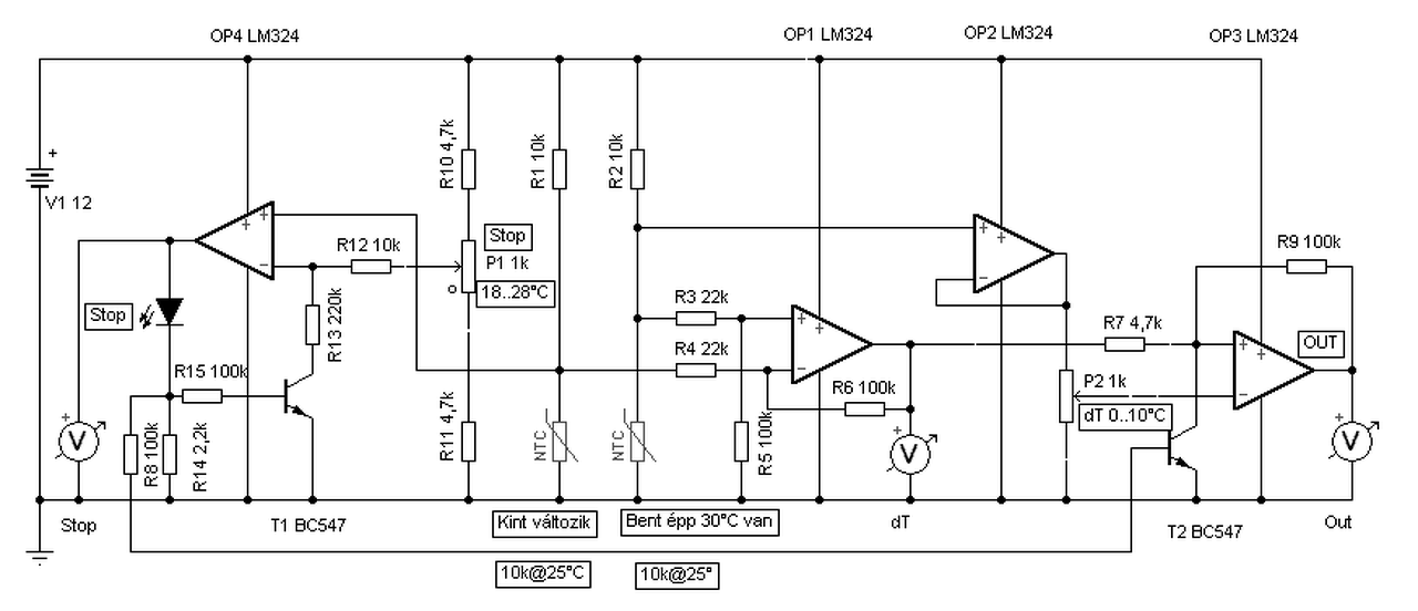 - Az OP1 egy különbség képző erősítő, melynek erősítése 4,5 körüli. Vagy is a termisztoros híd átlófeszültségét erősíti fel a GND-hez mérve 4,5-szörösére. - Az OP2 követő erősítő,annak kimenetén a belső NTC-n eső feszültség mérhető. Ez a dT referencia feszültségét adja. Az változik, mert a két hőmérséklet változásával, a különbségi feszültség is változik. - Az OP4 és OP3 komparátor. Annak kimenetén vagy nulla, vagy kb. 10V feszültségnek kell lenni. - T1 a pozitív visszacsatolása az OP4-nek, ez állítja elő a hiszterézist. A T2 kikapcsolja a fűtést, ha OP4 jelzi, hogy a STOP értéke alatt van a kinti hőfok. - Műveleti erősítő kimenetére nem kell felhúzó ellenállás, az fel tud menni magától is. A hozzászólás módosítva: Jún 11, 2014