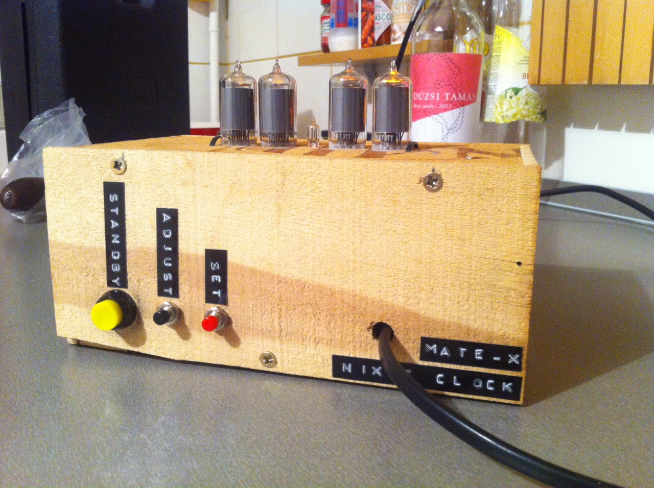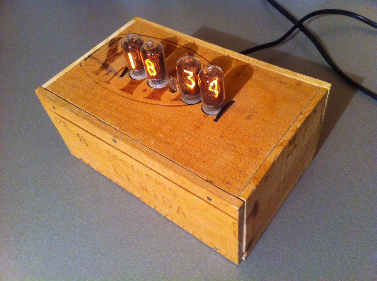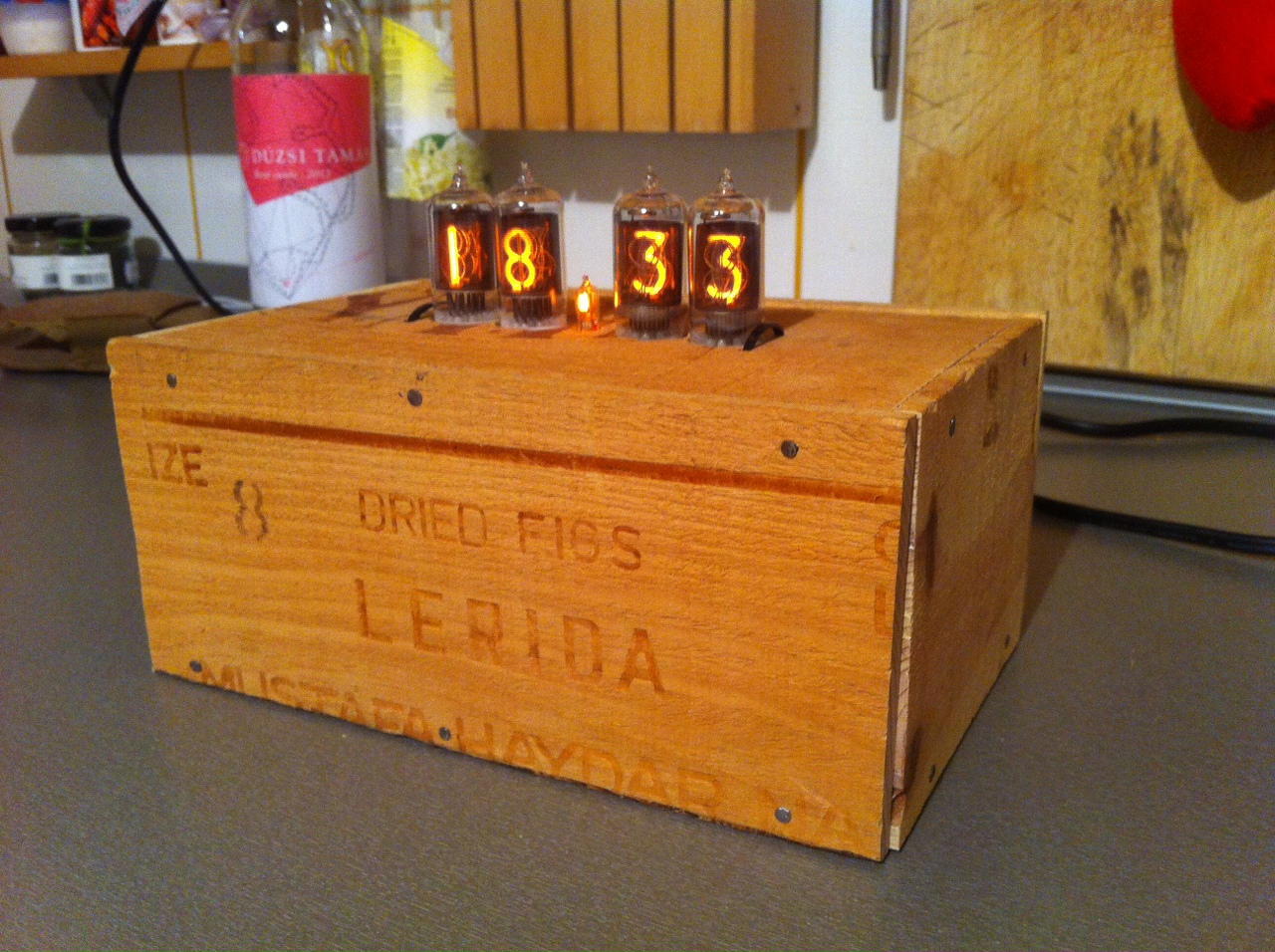 Legújabb nixie-s hőmérőm. Egyenlőre még nincs DS1820 hozzá, így a tesztrutin fut a csövekben. A program szerint, ha nincs a hőszenzor csatlakoztatva, akkor a számok lépkednek folyamatosan. A csöveket még csak úgy beledobáltam, a teszt kedvéért, szerencsére mindegyik számot szépen kijelzik. Elég zsákbamacskának néztek ki ezek a használt csövek.
