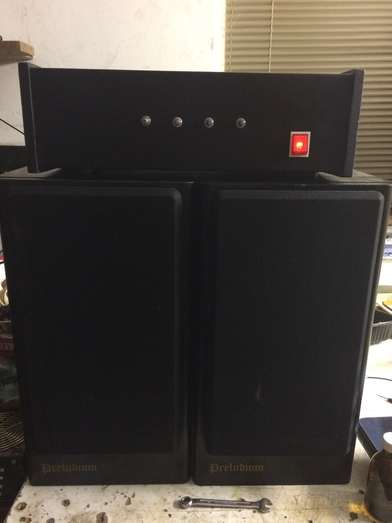 A végfok ST151 2×100W, előfok: NE5532+LM1036. A hangszín szabályzó panel lett az első amire még a pozíció rajz is sikerült. A hűtést egy 300×110×30 mm-es hűtőborda biztosítja, már csak a potméter gombok hiányoznak