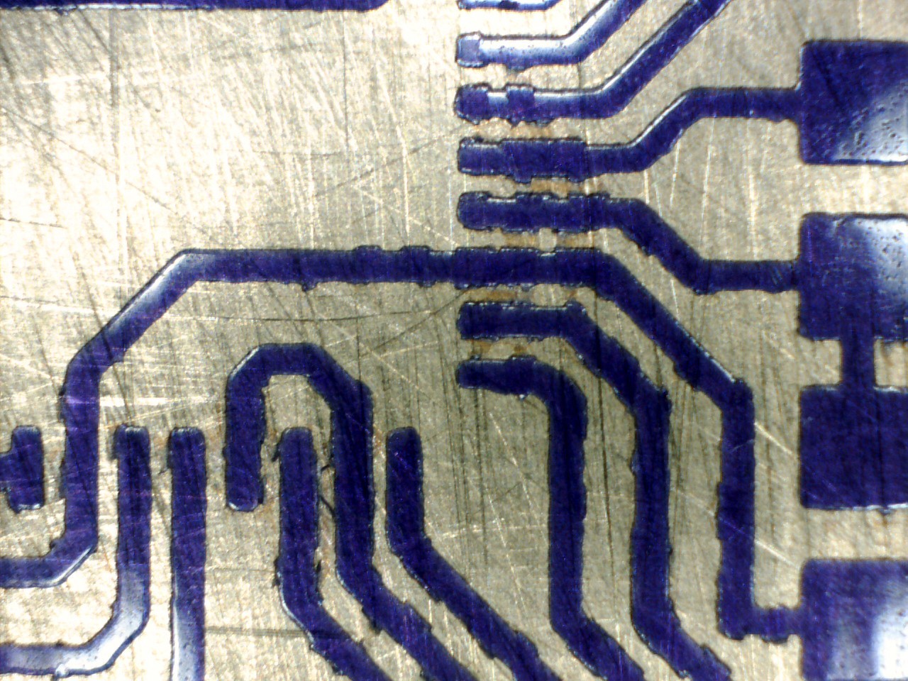 Elkészült az első próba előhívásom photoresist fóliával. Azonban a vezetősávok szélei elég csúnyák lettek. Ez normális? Vagy mit rontok el? Ilyen kis cafatok lógnak le.