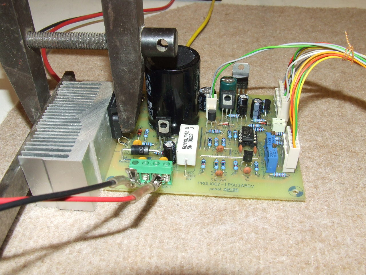 Egyenlőre külső labortápról tápláltam, külön a teljesítmény részt, és külön a vezérlést, illetve egy minimális hűtést adtam az áteresztő elemnek. Fel is lehet forrósítani rendesen, de az áteresztő jól bírja a strapát. A képen lévő bordával, ventilátor nélkül, maximális 3A mellett rövidre zárva, gyorsan nő a hőmérséklete, de mikor a kezem már nem képes a bordát megfogni, akkor még hibátlanul működik a táp.