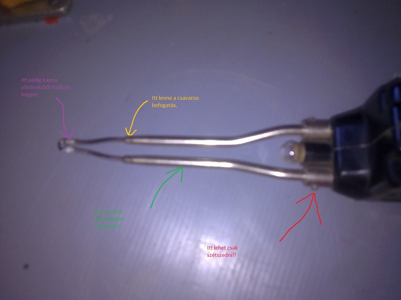 Van egy ilyen forrasztóm mint a képen látható de csak a tövénél lehet szétszedni,a hegye (szerintem acél,tuti nem réz) és kezd elégni. Arra gondoltam hogy megcsinálom olyanra mint a régi Cseh forrasztók hogy csak a hegyét lehessen cserélni,csavaros befogatású réz huzal.Szerintetek jó lesz úgy?Köszönöm a tanácsokat.
