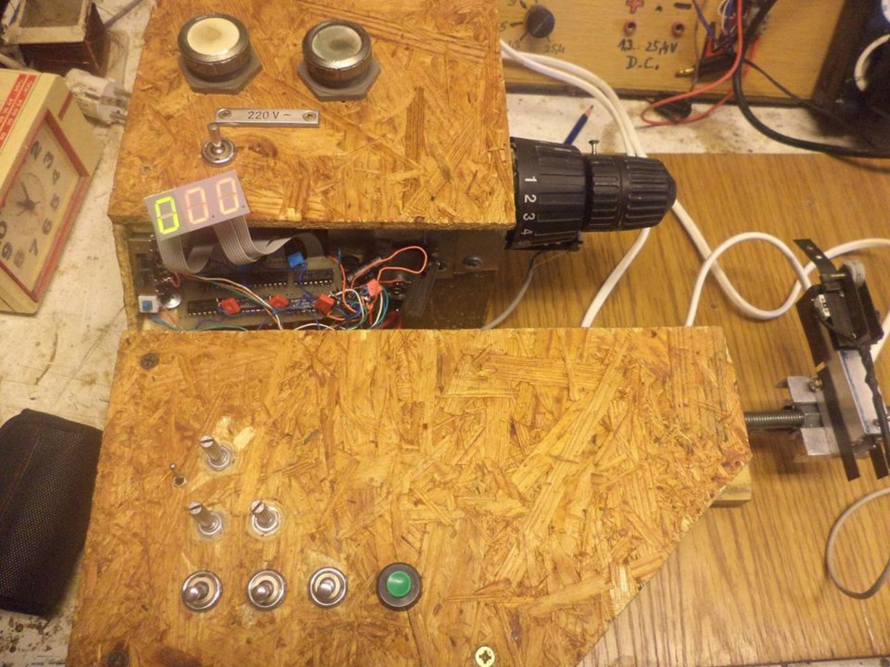 El készültem a tekercselőgéppel van benne digitális számláló, irány és fordulat szabályzó valamint egy huzal vezető ami folyamatosan teszi egymás mellé a huzalt ennek a végén van egy érzékelő ha eléri a cséve test szélét le áll a tekercselő és a huzal vezető is a zöld gombot megnyomom elindul újra tekercselés viszont a huzal vezető az ellentétes irányba indul addig még eléri a másik szélét a csévetestnek, de ha át kapcsolom a zöld gombtól barra lévő kapcsolót akkor folyamatosan megy oda-vissza. Tudom,hogy nem a legszebb darab de legalább saját tervezésű meg szemétből lett össze állítva 2db 74192 es meg néhány csavar lett hozzá véve.