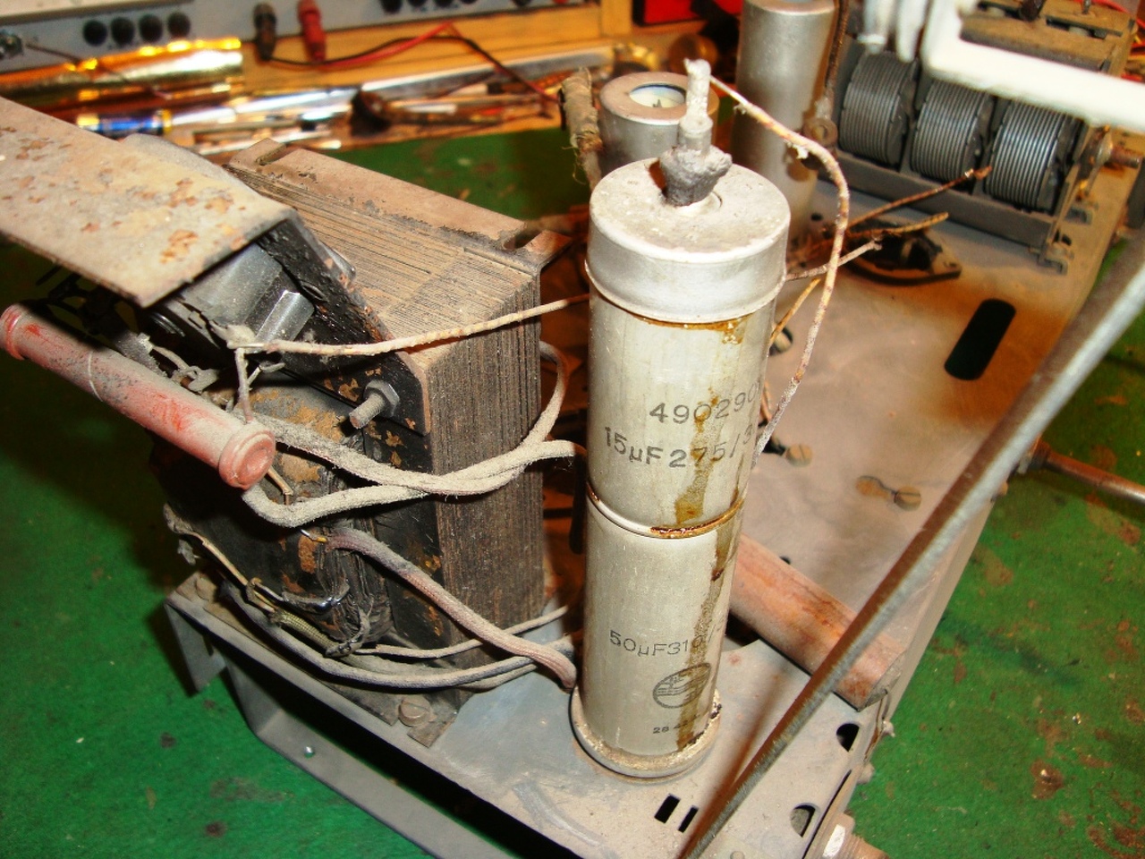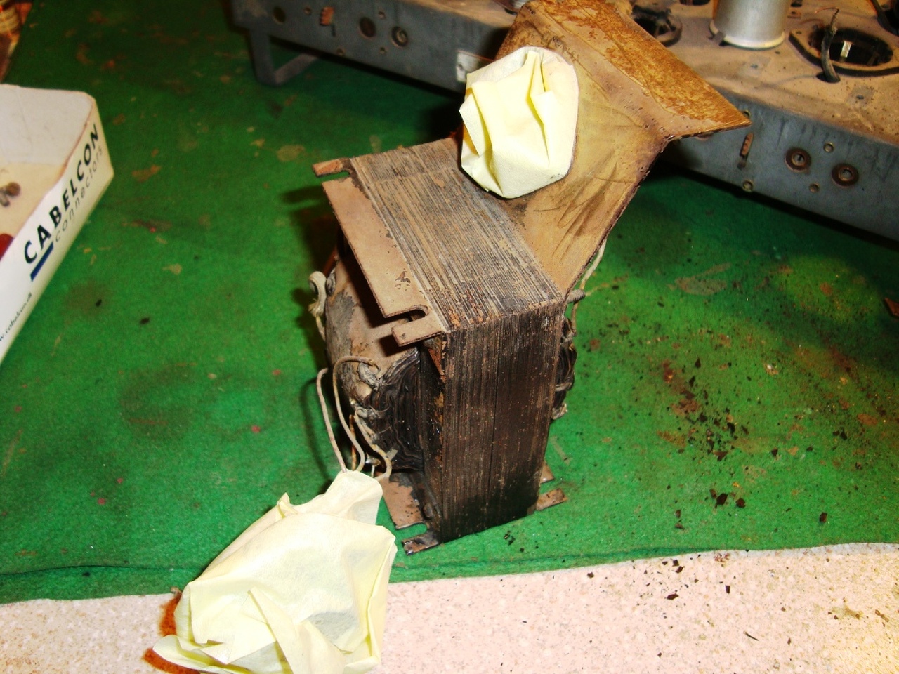 Ma a hálózati trafó került sorra. Egyébként hibátlan, csak csupa rozsda volt, nem hagyhattam úgy. Ki lett építve, (8 vezeték) kimaszkolva, lefújva feketére és visszarakva. Amíg száradt, megcsináltam a skálahúrozást. Kezd pofás lenni a gép, holnap megpróbálom elektronikusan beindítani. Ja és van még valami gond Köbzoli kedvencével. Tipikus háborús rádió, nem forrasztva hanem HEGESZTVE vannak benne egymáshoz az alkatrészek. Kész rémálom kicserélni benne valamit, mert ha le is csípem csípőfogóval, a maradék hegesztett, oxidált felületre nagyon nehéz újat forrasztani.