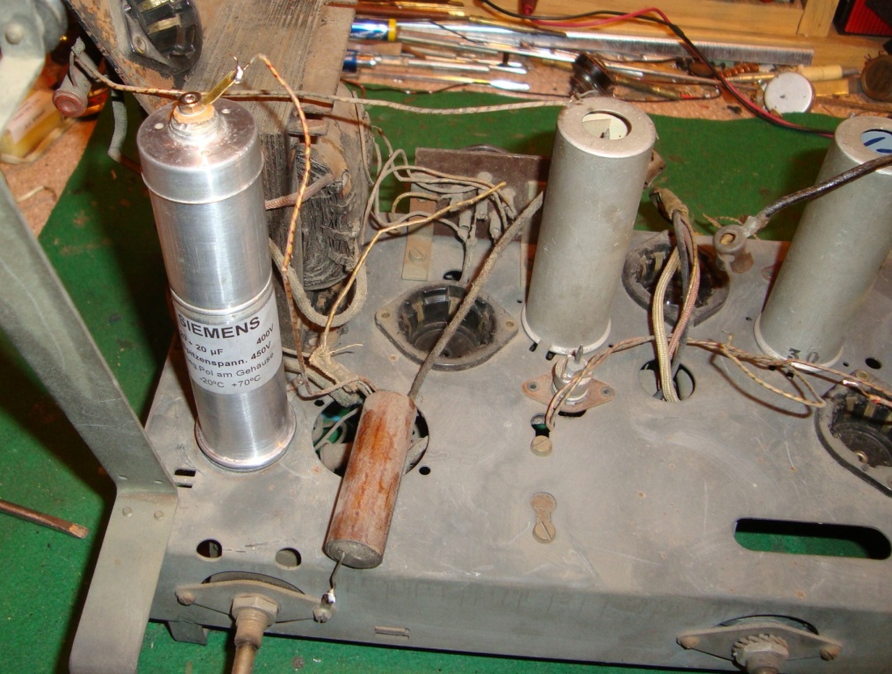 Folyt: Mint írtam, a mai nap a megszólaltatásra volt szánva, ami sikerült is. Először kinyomtattam a rajzot, majd az alapján visszakötöttem a tápot, kivettem a feleslegesen pótlólag berakott elkót, ellenállást stb. Aztán keresztet vetettem, és neki a 220-at. Meg is jött valami recsegés, torz hangfoszlányok, úgy hogy mérés. Elsőre a végcső rácsán mert ez már sok éves tapasztalat. Persze itt is +90V. Érdekes, hogy ezeknek a régi készülékeknek a hangfrekis csatoló (trióda anód-végcső rács) kondija 99%-ban át van ütve. Ezen is 3500 V átütési fesz. van írva, ott pedig alig van 150V mégis vezetett. Hajszárítóval megmelegítve, bele kihúzva, és új kondi beépítve, a régi házába. Ezután már szépen megindult, nincs is nagyon elhangolódva ami ennél a típusnál ritka szerencse. Szóval szépen szól, heuréka.