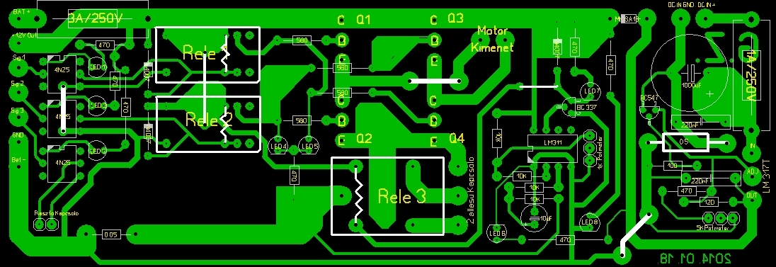 Készen van a DC motor vezérlő, amin régóta dolgoztam. (a gyakorlatban kiderült apróbb bakik kiküszöbölése folyamatban van, viszont ez így ahogy van, jól működik). Amit csinál az elektronika: trafó szekunderéről fogadja a feszültséget, a kimenetén pedig gombnyomásra indul-megáll-ellenkezőleg indul a DC motor. Infra sorompó jelét figyeli a mikrovezérlő (rövidzárlat) és ha ez nem teljesül, akkor megszakad a csukási folyamat. Kikapcsolt állapotban rövidre zárja a motor 2 érintkezőjét, így fékezve azt. Terhelésvédelem figyeli a motor által felvett áramot egy soros ellenálláson keresztül, és a felhasználó által beállított érték fölött lekapcsolja a reléket. A mellékelt program Attiny45-re lett írva. A c fájlban a kommenteket NE vegyétek figyelembe, még a legelejéről maradtak benne, sok helyen hülyeségek vannak beleírva, maga a program viszont működik. Hátha valakinek valami hasonlóra lenne szüksége. Szerk.: És ami a legfontosabb: köszönök minden segítséget proli007-nek és mindenkinek, aki segített, hogy ez létrejöhessen. A hozzászólás módosítva: Feb 26, 2014