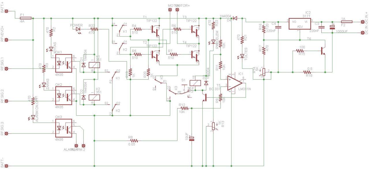 Az elején van a távirányító jelének a fogadása, ezután van a motorvezérlés, ezt követi az erőhatároló és végül egy akksitöltő. Fel van cimkézve, remélem érthető az egész. A tranyók TIP 122-esek, de kipróbáltam már mással is, de ezek vannak benne alapból.