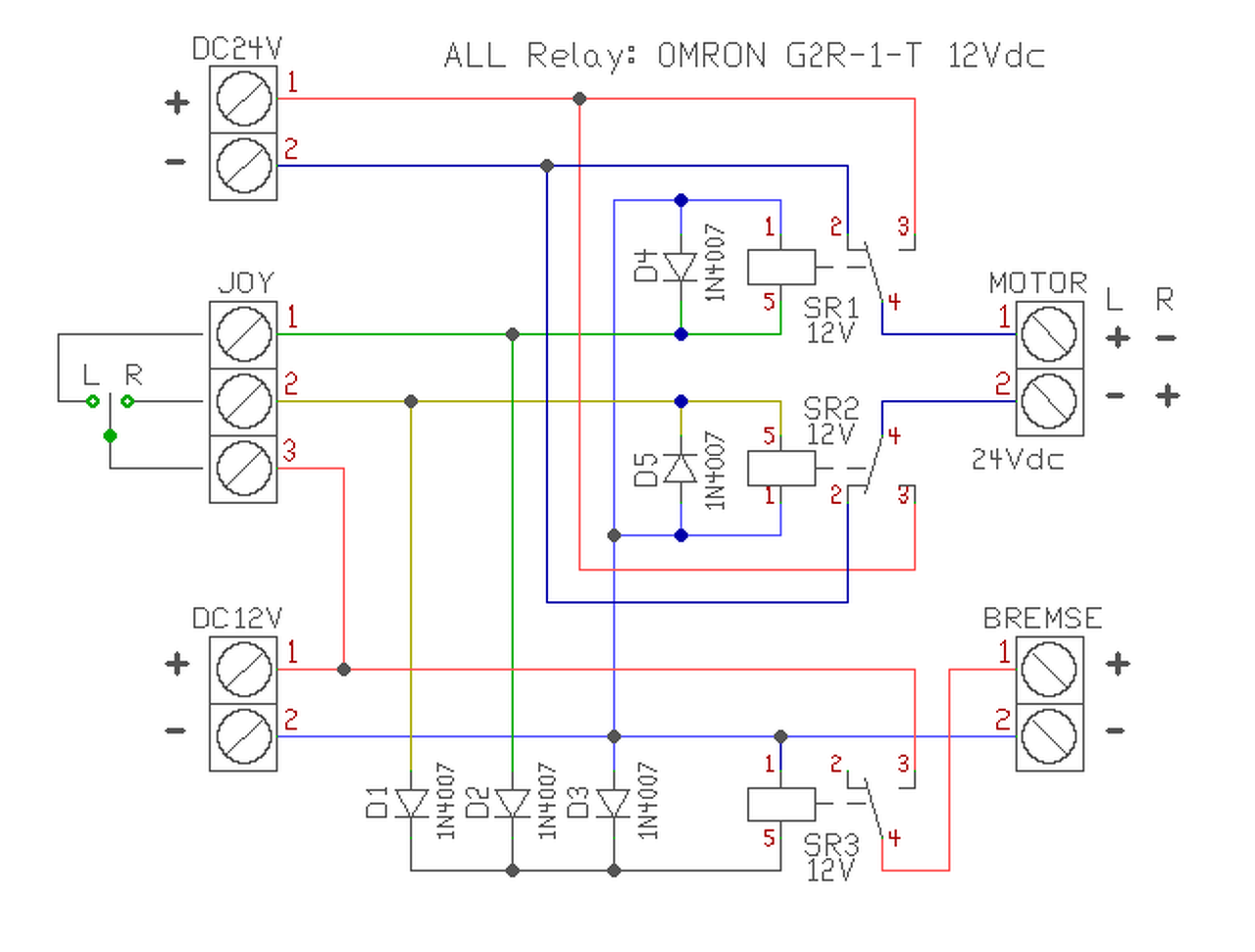 Új vagyok itt a fórumon. Végig szemezgettem a szóba jöhető topikokat a kérdésemre, de konkrétan az én problémámra megoldási javaslatot nem találtam. Nem értek az elektronikához, ezért elnézéseteket kérem előre is a helytelen kifejezésekért. Sosem csináltam hasonlót, így nincs tapasztalatom. Útmutatást szeretnék kérni egy DC 24V-os fracmo hajtóműves fékes villanymotor (o/p 11.0 Nm; A 10.5; RPM115) bekötésében hálózatról táplálással. (2+2 kivezetése van, 24V villanymotoré, és 12V a féké.) (Korábban egy mozgássérültnek való elektromosszéket hajtott) A terhelés alatti indítóáramát nem ismerem) Van egy Gould MG24-15C kapcsolóüzemű tápegység, amiről szeretném meghajtani a villanymotort. 15A terhelhetőségű Amit szeretnék, az az, hogy azonos fordulat mellett forgásirány váltással tudjam üzemeltetni egy (meglévő) joystick kapcsoló segítségével (ami vélhetőleg 10A+ terhelést nem bírna el) A fórum böngészése közben vált világossá, hogy egy relé kellene nekem erre acélra, de a méretezését és a bekötését nem tudom. Azzal is szembesültem hogy a fék 12Vot kíván, (fogalmam sincs hány ampert), erre egy PC táp (300W), vagy egy szünetmentes táp (600VA) állna rendelkezésemre. Vagy bármi nemű pénztárca kímélő megoldást szívesen meghalgatnék (A kapcsolószekrény IP védelmét és szellőztetését majd vhogy megoldom.) Tudnátok segíteni ebben? Elvárások: Óránként szakaszosan 2-2 percet kéne dolgoznia (kültérben, poros környezetben) A joystick kapcsoló 1 stabil pozíciós +2 állású stabil pozícióban a villanymotor nem kapna áramot és a féknek kéne fognia további 2 pozícióban fék kiold és relé behúz A hozzászólás módosítva: Jún 27, 2014