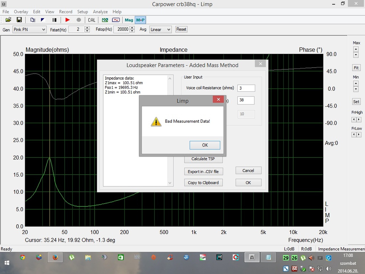 Elnézést a késői válaszért de sajnos 4 műszak mellett kevés idő marad leülni nyugodtan és méregetni. Lemértem egy 50dkg-os súllyal is. Az Fs le is ment 19,66Hz környékére. De hiába helyettesítek be mindent tökéletesen ha rákattintok a Calculate TSP-re ugyanúgy feldobja a hibaüzenetet. Lehet ott lesz a bibi hogy a Vas értéket nem tudtam kiszámolni a súlyos mérés miatt. Vagy ilyenkor is ki lehet valahogy számolni? A hozzászólás módosítva: Júl 2, 2014