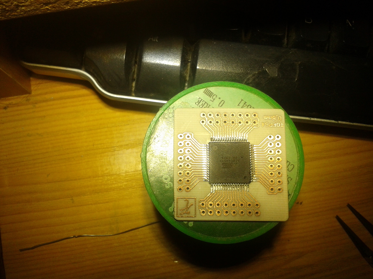 ) fórumtárs által készített TQFP adapterre. SMD-t már forrasztottam, de ilyet még nem, szóval ez az első ilyen méretű alkatrész. Elsőre szerintem egész jó lett, zárlat sehol.