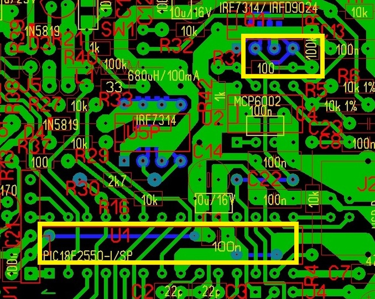 Köszönöm a listát sokat segített, így 5 óra alatt sikerült elméletben mindent hiánytalanul megrendelni! ![]() Tanulmányoztam a nyákot, és feltűnt pár dolog amit nem teljesen értek: - az a két átvezetés a pic alatt a forrasztási oldal felől vagy a pic tokja felől kellene legyen? - a pic alatti rövidebb átkötés (képen jobb oldali) szükséges egyáltalán? Az a vezetősáv össze van kötve alapból nem? Vagy az ilyen "biztonsági" okokból van? - a C1-et (100nf) a pic alá kellene valahogy bezsúfolnom vagy az a másik oldalra kell kerüljön? - végül az IRF7314 fet adapter kártyája zavart meg, mert a nyákon a Q4 2-es és 4-es lába össze van kötve, de van ott 1 kék vonal (képen sárgával bekereteztem), ami az adapter kártyán nincs. Rossz helyen keresem vagy az oda felesleges? Remélem nem kérdeztem sok baromságot.