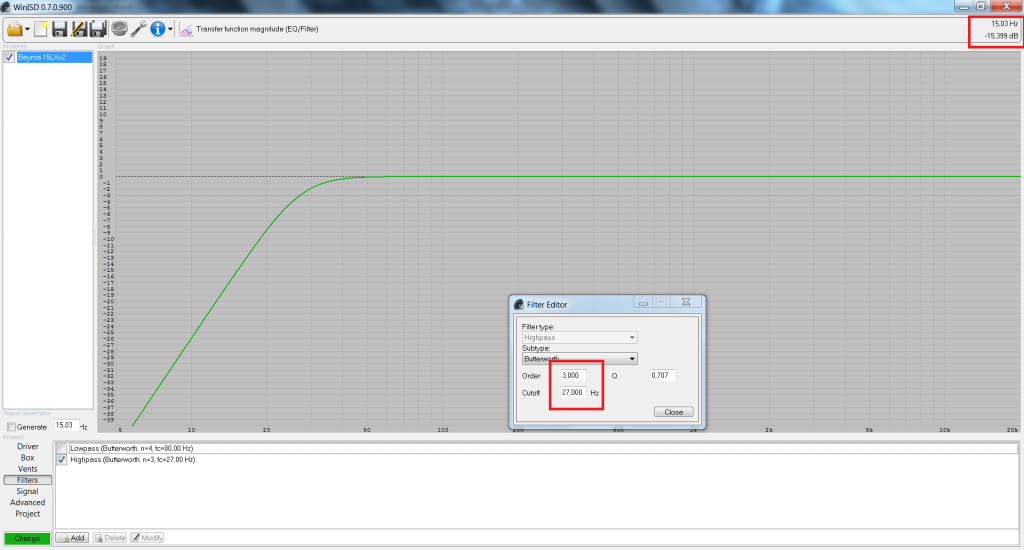 Első gondolatom hogy egy 3. rendű aktív váltó az megfelel egy 3. rendű passzív váltónak. Viszont ha ez igaz akkor jön amit nem értek. ![]() Megépítettem (nem teljesen, részletek később) ezt a kapcsolást, ez egy Rumble filter (HPFfilter). Nah már most, elvileg 2 db 18db/oktáv meredekségű szűrő van sorba kötve, így lesz 6. rendű az egész. Viszont a magas csoportfutási idő miatt, csak az elejét építettem meg ami 3. rendű és 27Hz lett az F3 pont.. És most jön amit nem értek, megépítettem. Bekapcsolom, a feszültségek rendben, nincs füst se. Viszont lemértem RMAAban és ARTAban is a dolgot, és összehasonlítottam a WinISDben található elméleti grafikont és rájöttem hogy amit összeraktam csak 2. rendű és nem 3., meg az F3 pont csak 26Hz lett az alkatrészek szórása miatt de ez nem fontos. Linkelek pár képet hátha valaki megfejti.A képeken be van jelölve pirossal, ami lényeges.