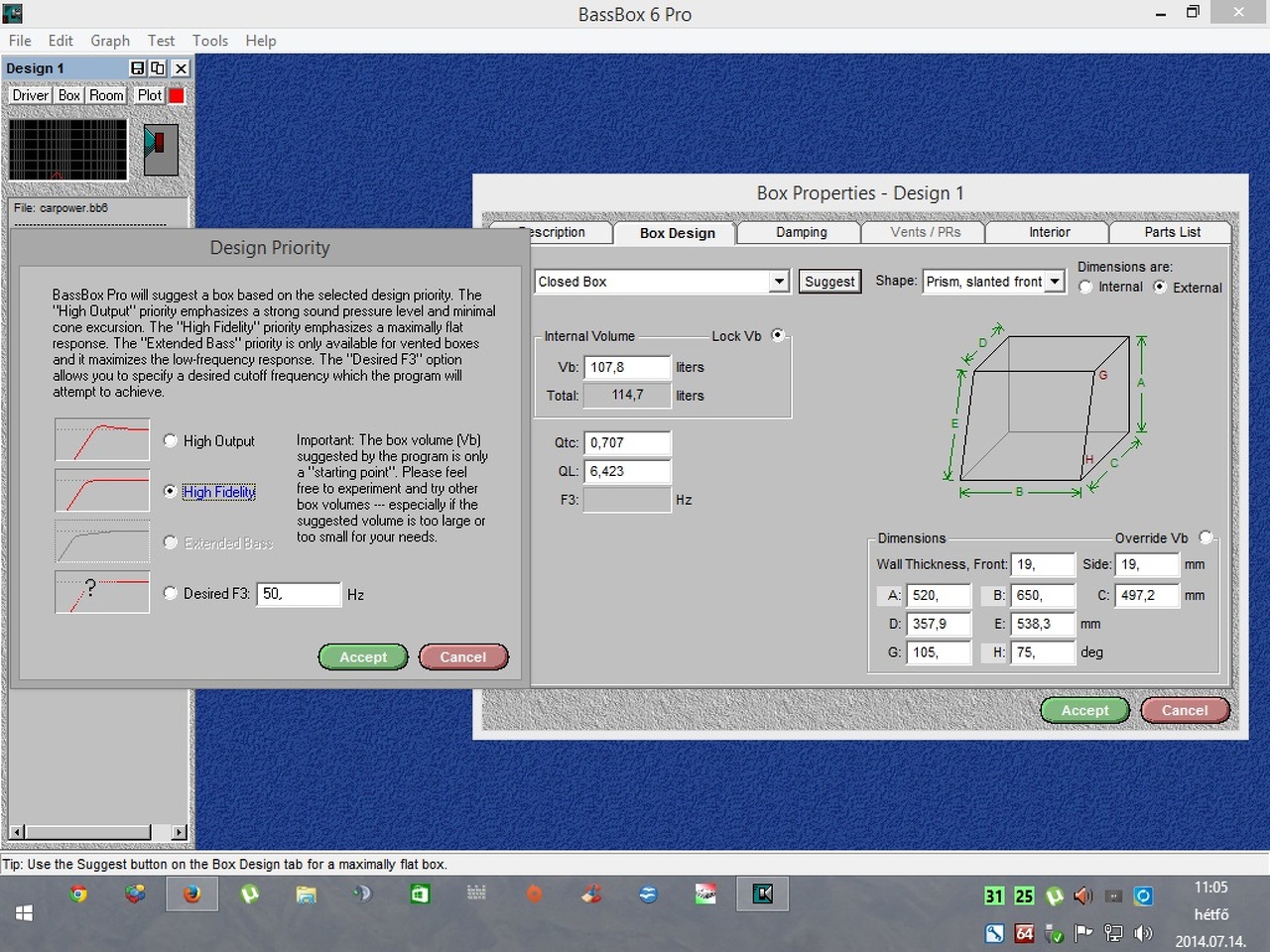 Sikerült is megoldani a galibát vele, egyszerűen csak le kellett frissíteni a programot. ![]() A hangolásról érdeklődnék még, Subvoice oldalán tanulmányozom a tanokat, és ott azt írják hogy 0,707-es Qtc-re érdemes törekedni, nekem a bb6 egy az egyben arra lőtte be a Qtc-t, így lett a képen is látható 107,8 literes láda. A hangolásról és annak menetéről van esetleg más tanulmány vagy iromány? vagy esetleg program amivel könyebb megérteni és begyakorolni egy-egy láda hangolását? Köszönöm a sok-sok segítséget! A hozzászólás módosítva: Júl 14, 2014