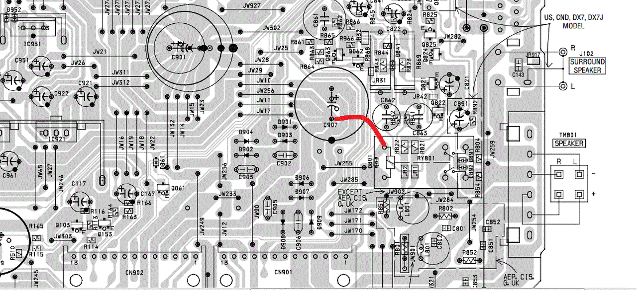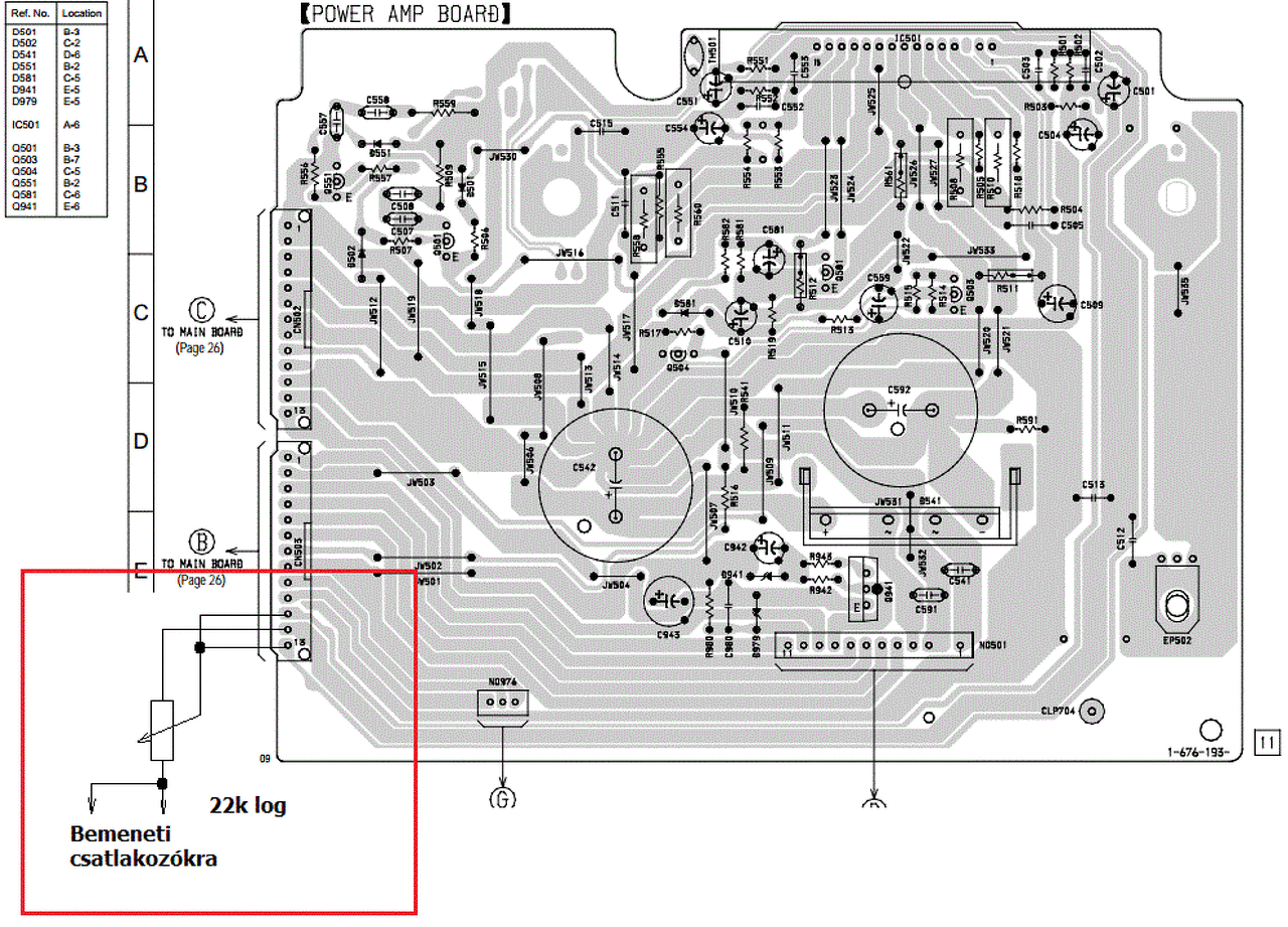 Az erősítő panelen van némítás funkció, annak az állapotát egy méréssorozattal lehetne felmérni. A biztos kiiktatása a Q504 kollektor-emitter összekötésével történhet, berajzoltam pirossal a panel közepén.