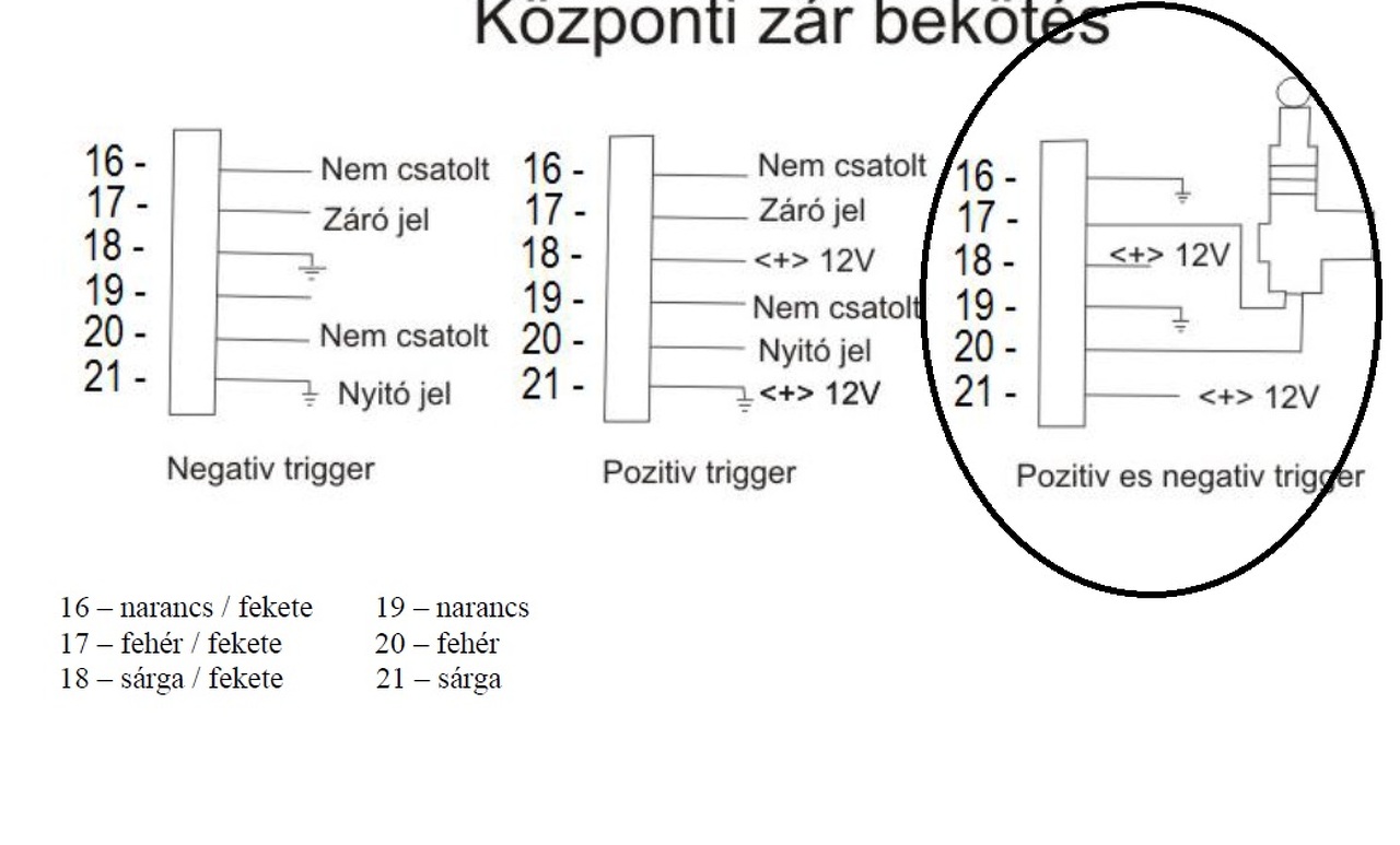 Ezen kívül, nyitott ajtóknál nem működteti.... JP1 benne van a leírásban...A rajzod alapján: relé 1 87a=-> riasztó 16 relé 1 30=-> riasztó 17 relé 1 87=-> riasztó 18 relé 2 87a=-> riasztó 19 relé 2 30=-> riasztó 20 relé 2 87=-> riasztó 21 16. Központi zár impulzus idő beállítás: Függően attól hogy az autónk milyen típusú kp.i zárral van szerelve, a JP1 segítségével kiválaszthatjuk, hogy 0,5 vagy 3,5 mp legyen a vezérlő impulzus. Ezt a kapcsolót a vezérlő egység belsejében találjuk. Alapbeállítás 0.5 mp. A hozzászólás módosítva: Júl 12, 2014