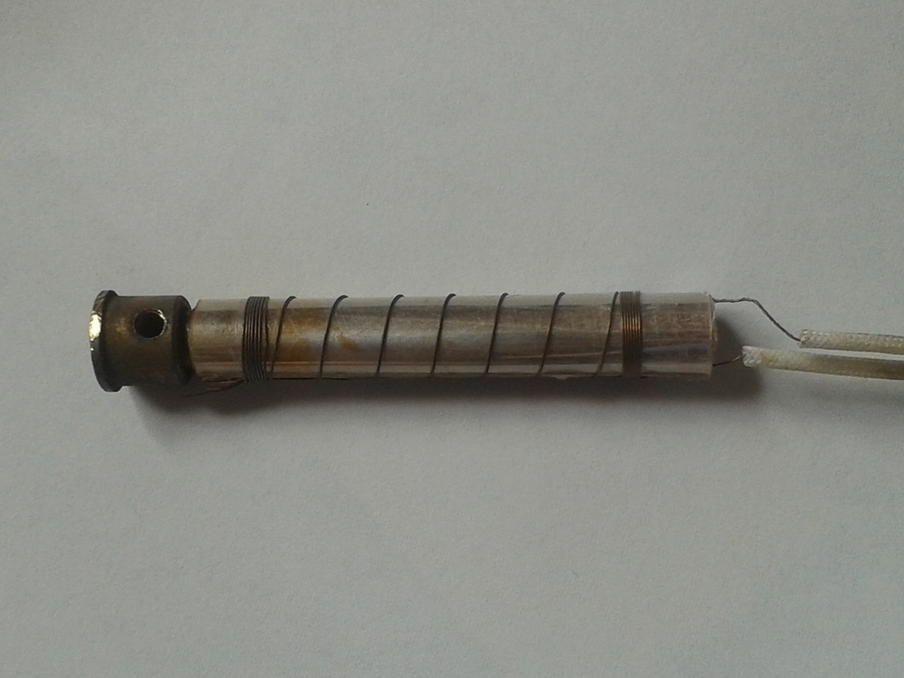 Hát ez tényleg valami nagyon elfuserált konstrukció - a pákahegytartó meghosszabbított részére van egy gyűrű tekerve csillámból (ez nagyon jó szigetelő), és erre van tekerve kívülről a fűtőszál.