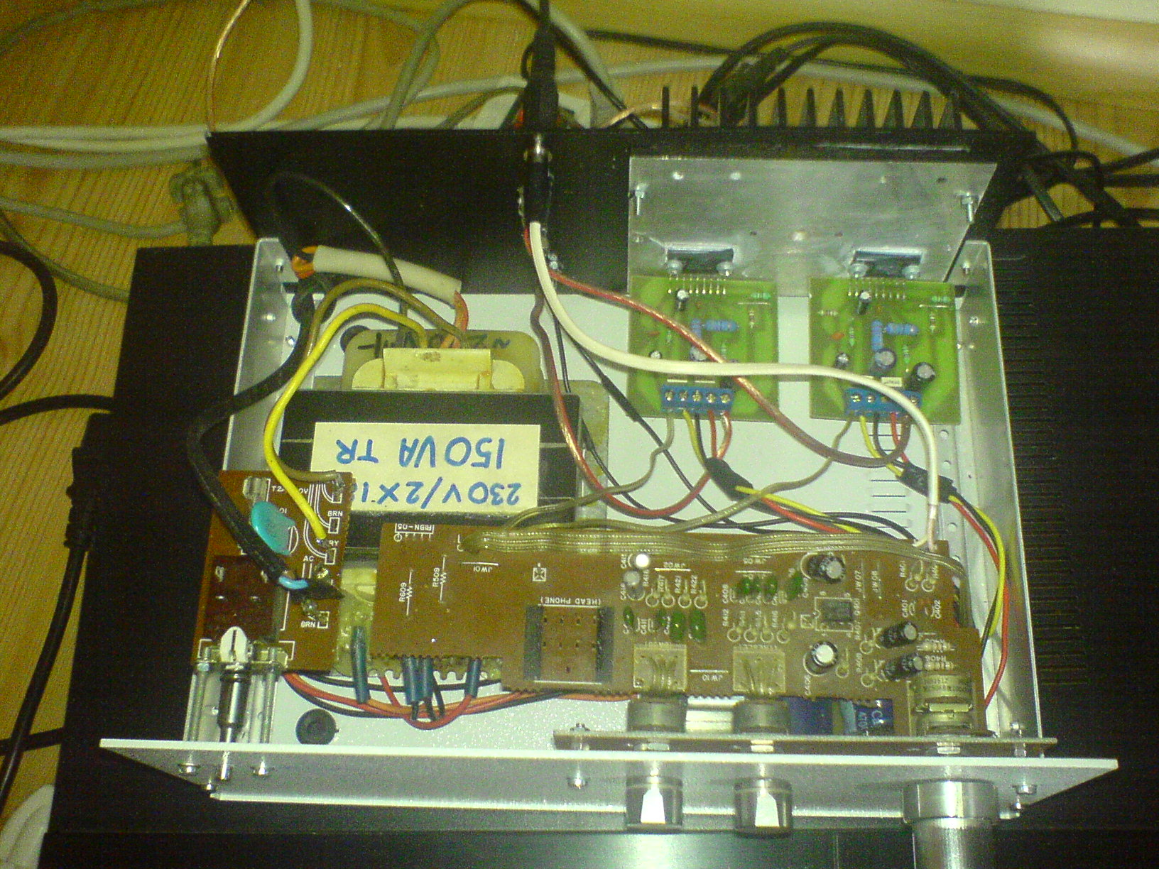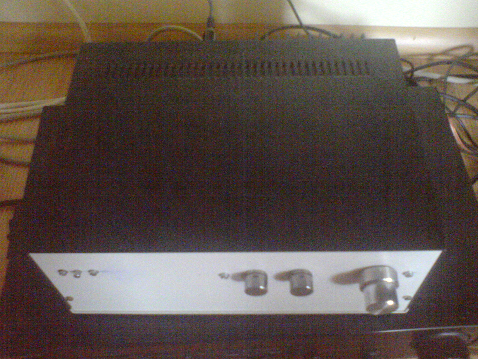 Ma reggel fél háromkor lettem kész az erősítőmmel! Vegfoka két darab TDA1514-esből áll, az előfok egy toshiba deck-ből lett bontva, a hálózati kapcsoló is abból van. Hely hiány miatt a táp az előfok alatt kapott helyet. van benne 1-2 felfogatási és szigetelési és lemezmegmunkálási megoldás ami a saját szemem is szúrja de nézzétek el nekem mivel kezdő vagyok íme 1-2 kép: