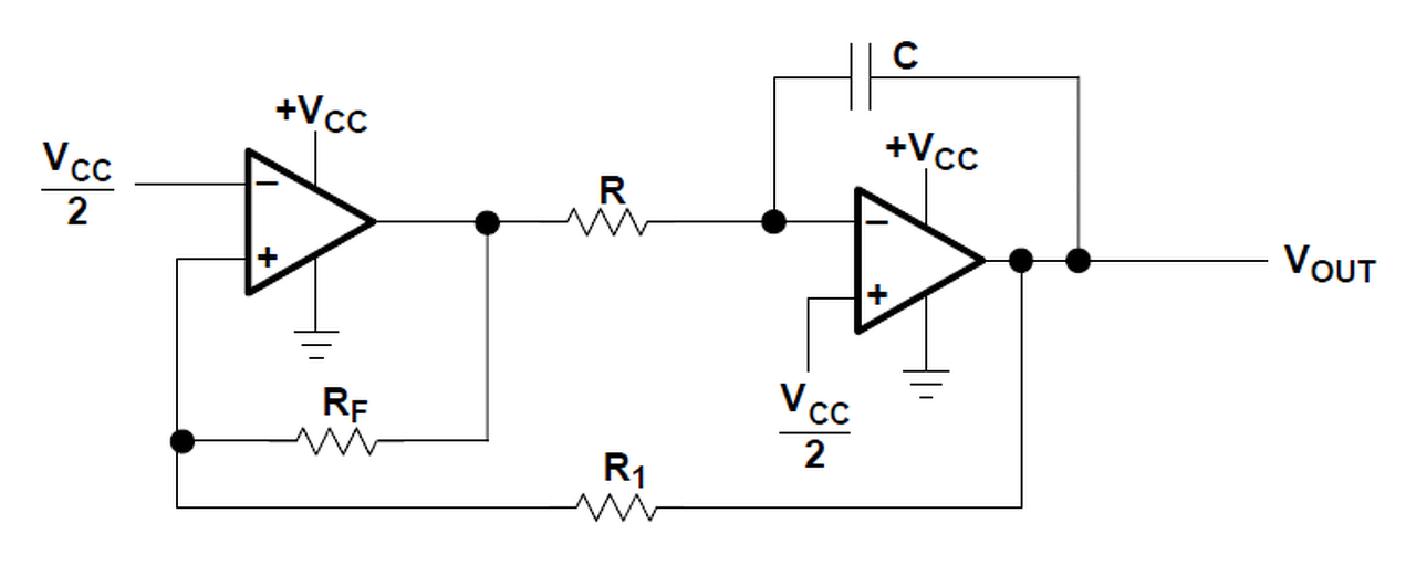 Az értékek egyébként a következőek: R=22K, C=100nF, Rf~68K, R1~47K nagyságrendű.