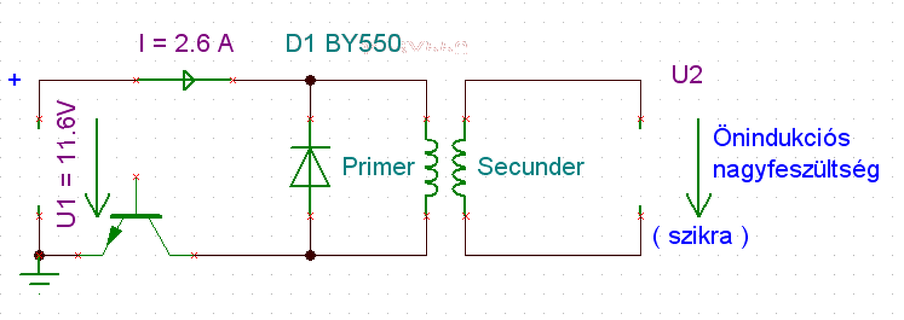 Egy önindukciós nagyfeszültséget szeretnék előállítani amihez csináltam egy tervet, és a kérdésem az lenne hogy ha a primer tekercsen folyó áramot megszakítom egy tranzisztorral, akkor a primer tekercsben létrejövő önindukciós feszültséget ami ellenkező irányú áramot indít meg, egy diódával rövidre zárhatom-e. A primer tekercsen a feszültség kb: 11.2 - 11.9V között alakul majd, és 2.1 - 2.8A áram folyik majd keresztül rajta. A tranyó emitter bázis felőli része most nem érdekes azért nem is rajzoltam meg, a lényeg hogy ekkora feszültségen ekkora áramot fog kapcsolgatni és nem szeretném ha a primer önindukciója tönkre tenné. A rajzon látható módon megvédhetem? Jó egyáltalán az elképzelésem? Egy olyan diódát választottam ami 1000V és 5A -es. Elég ekkora? Köszi a segítséget!