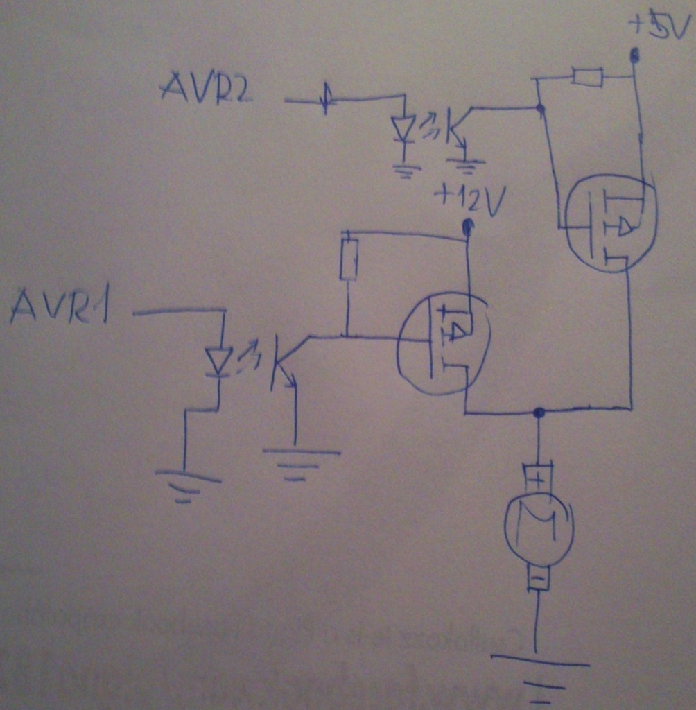 Adott néhány motor, amit egy PC tápról hajtanék. 2 fokozat szükséges, amihez pont ideális lenne a tápegység 5 vagy 12V-os ága. Természetesen menet közben állíthatónak kell lennie. A föld ugye közös, így arra gondoltam, hogy tennék a motor és az 5V közé egy, illetve a motor és a 12V közé is egy p csatornás MOSFET-et, amiket optocsatolóval kapcsolnék be (azért opto, mert az van itthon). Az egészet egy AVR vezérelné. (PWM kilőve, mert a motor megáll tőle, sajnos.) Így a motor éppen akkora feszültséget kapna, amekkora megfelelő a fokozatnak. Szerintetek mennyire biztonságos ez a megoldás így? Mellékletben csatolok egy kapcsolási rajzot. A hozzászólás módosítva: Júl 12, 2014