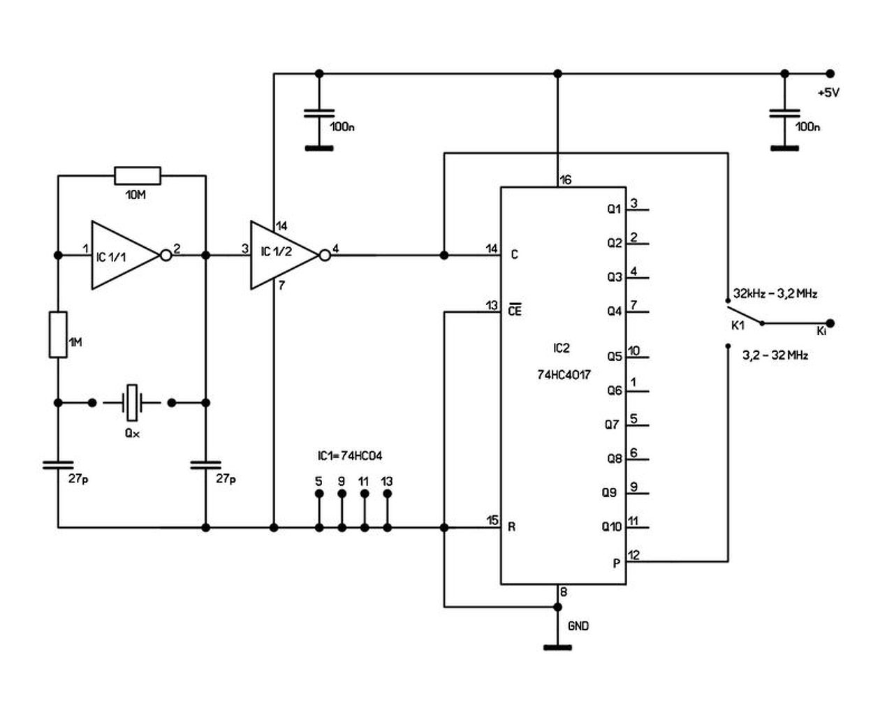 Második nekifutásra az adapter oszcillátorát kiegészítettem egy 7490 tízes osztóval, ezzel már 32 kHz-32 MHz-ig lehet kvarcokat mérni. A probléma csak az volt, hogy az adapter csatlakoztatásakor, a 7490 áramfelvétele miatti feszültségeséstől a teszter újraindult. A jelenlegi formában hibátlanul működik, kétoldalas nyákon, SMD alkatrészekkel. Az oszcillátor 74HC04, az osztó pedig 74HC4017-tel van megépítve. Ha valakit érdekel, melléklem a kapcsolási rajzot.