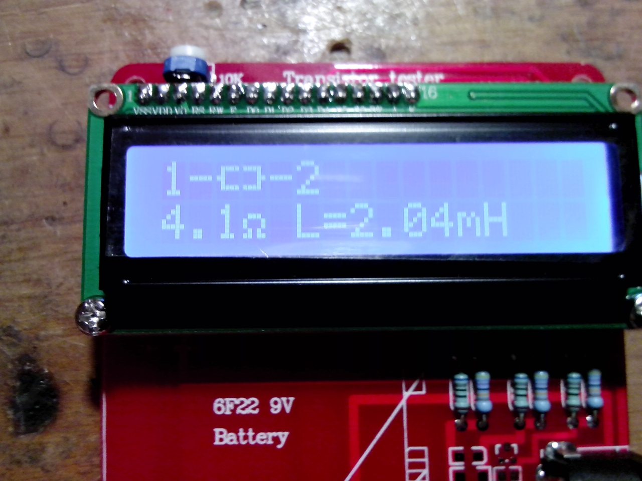 Elsősorban induktivitás mérés miatt van rá szükségem.Össze állítottam és gyorsan ki is próbáltam pár különböző tranzisztorral,diódával,kondival és ellenállással.Ezeket szépen fel is ismerte és (ellenállás tekintetében,DMM-el összehasonlítva) kellően pontosnak bizonyul.Majd ahogy időm engedte kipróbáltam egy induktivitáson amit szintén jól megmért elsőre (4.1Ohm / 2.04mH),de...
