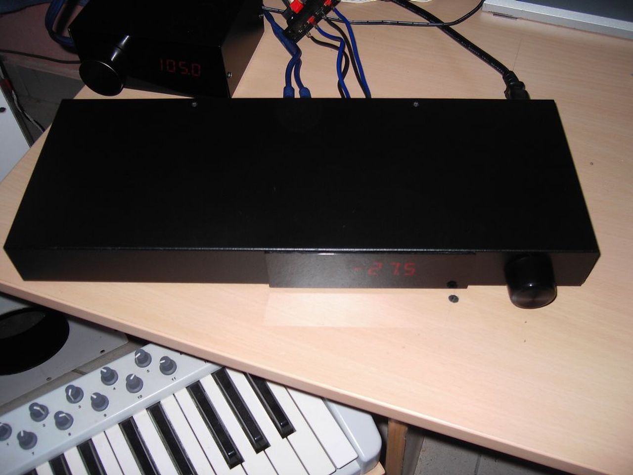 Sajnos megtapasztaltam a vendéglátós éveimben, hogy ekkora ládákat csigalépcsőn fel-le másképp nem is lehet mozgatni. A pendrájvon kívül fogad SD kártyát is, az nem áll ki belőle, élesben majd azzal használom természetesen. Ott ahol a távirányító van, még a későbbiekben egy tremolo és egy flanger effekt kezelőszerveit tervezem tenni, de egyenlőre marad így.