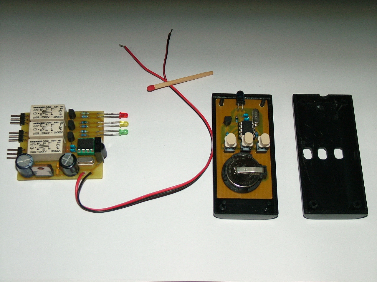 Ez a kis három csatornás távirányító még a nagy kijelzős órám tartozéka (ezzel tudom éjszakára kikapcsolni a tehenet). A megépítésénél egy kicsit kapkodtam, meg is látszik rajta!