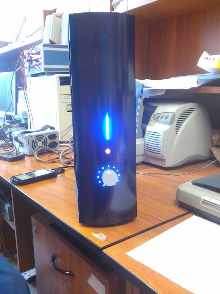 Nem a kivezérlésmérőre vagyok a legbüszkébb hanem a hangjára, mert nagyon bitang. A kivezjelző sima 40ledes mega8-al. A fényerőt meg mindenből vissza lehet venni, de így sem fényes csak kicsit furán mutat a fotón a festés miatt, olyan élőben mintha kék köd lenne a ledek körül. A telefon meg nem vezérlés csak audió forrás volt nagy hirtelenjébe, a vezérlést egy mega16 végzi.