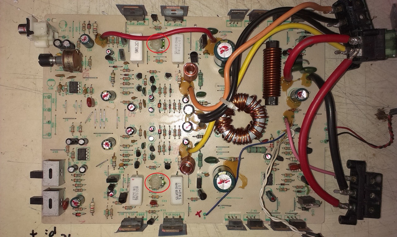 Nem a jelerősség bemeneti potira gondoltam. A bekarikázott kettőre, ami lehet, hogy munka poti, mert le is volt taknyolva, hogy ne lehessen tekergetni. Az alsó volt a hibás (kontaktos), az az oldal melegedett jobban, valamint az okozta a ki-bekapcsolgatást. A felső jó értékét lemértem és kicseréltem mind a kettőt, majd erre beállítottam az újakat.