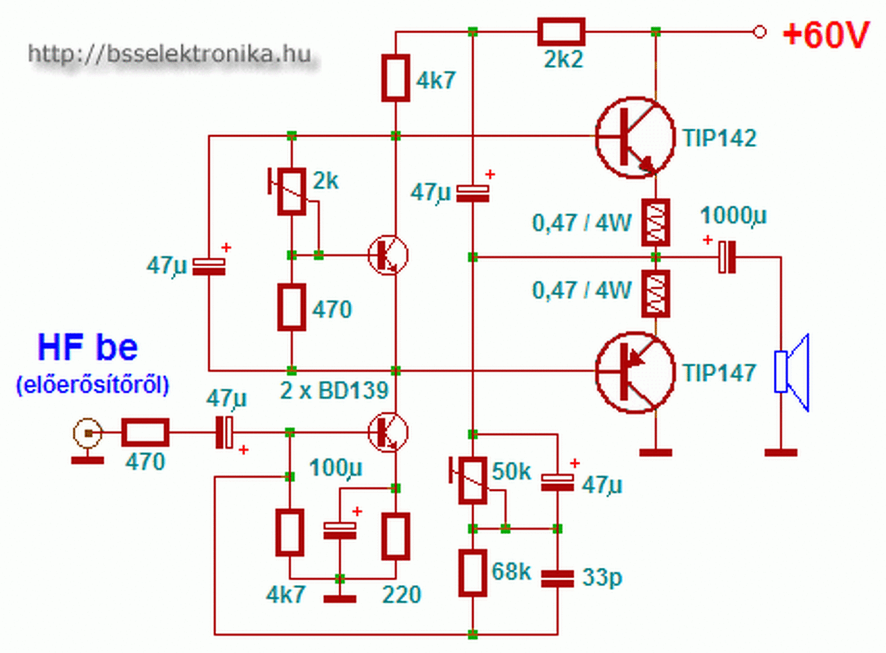 A végtranzisztorok alul vannak méretezve, de a 8 ohm 70W belefér maximálisnak.
