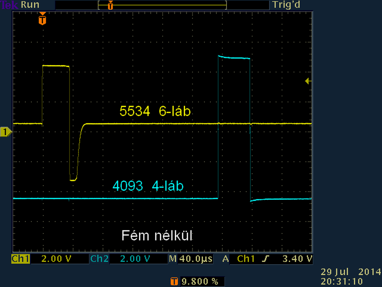 CD4093 8, 10-es lábakon ugyanaz volt a jel, amit nem bírtam fényképezni. Volt egy 6V-os vízszintes sáv, amibe voltak nagyon rövid 3,3V-os beugrások.