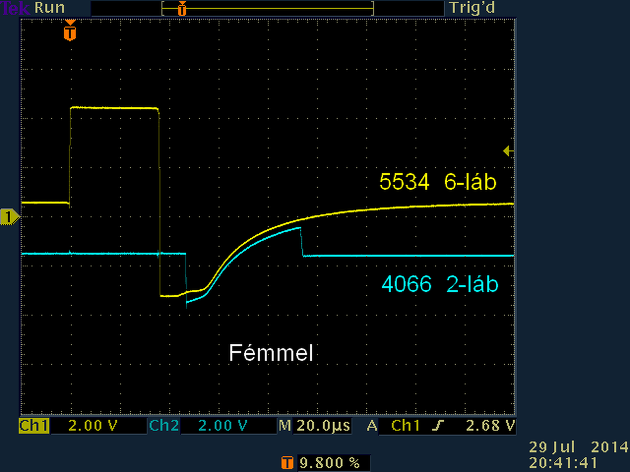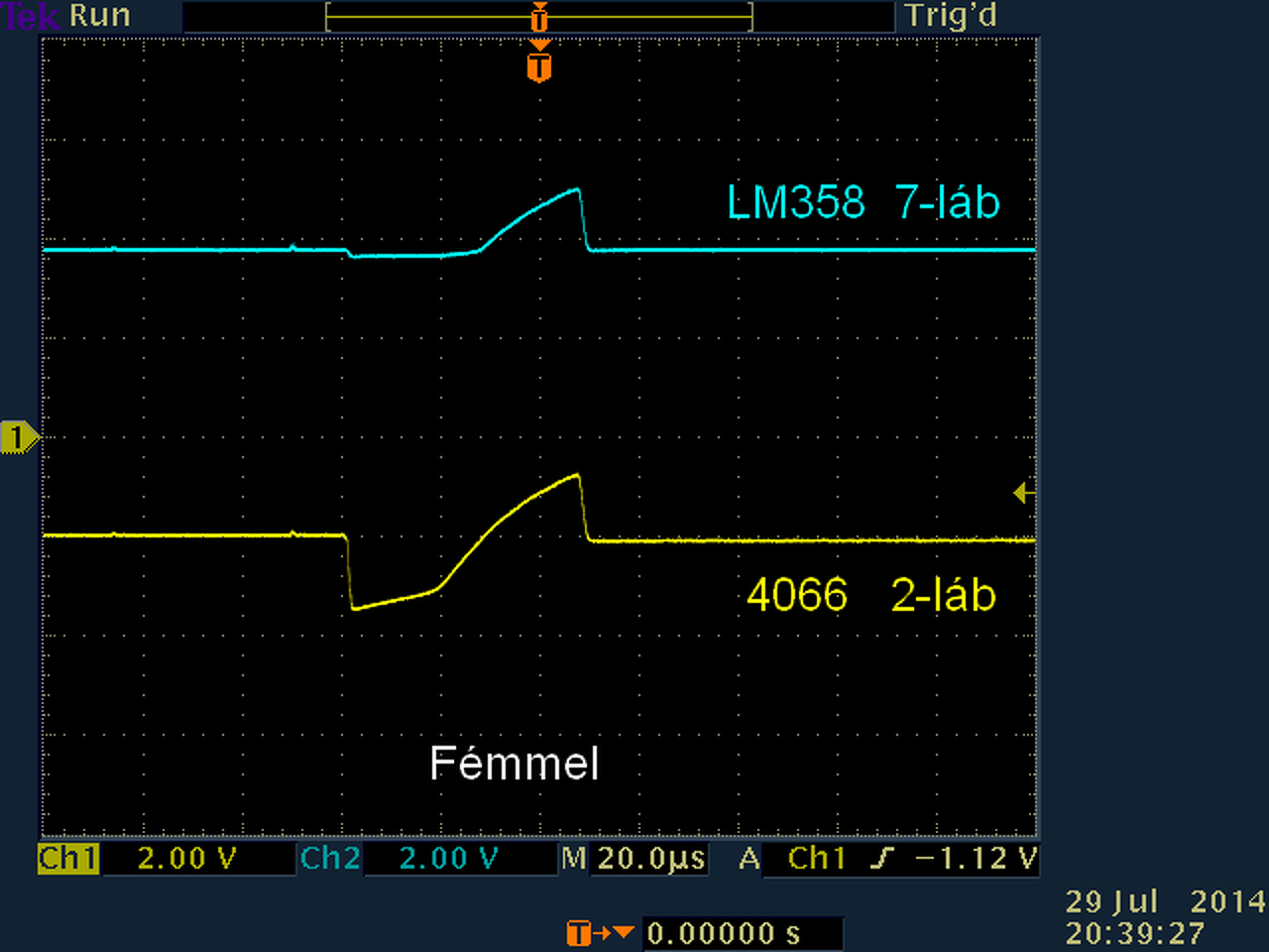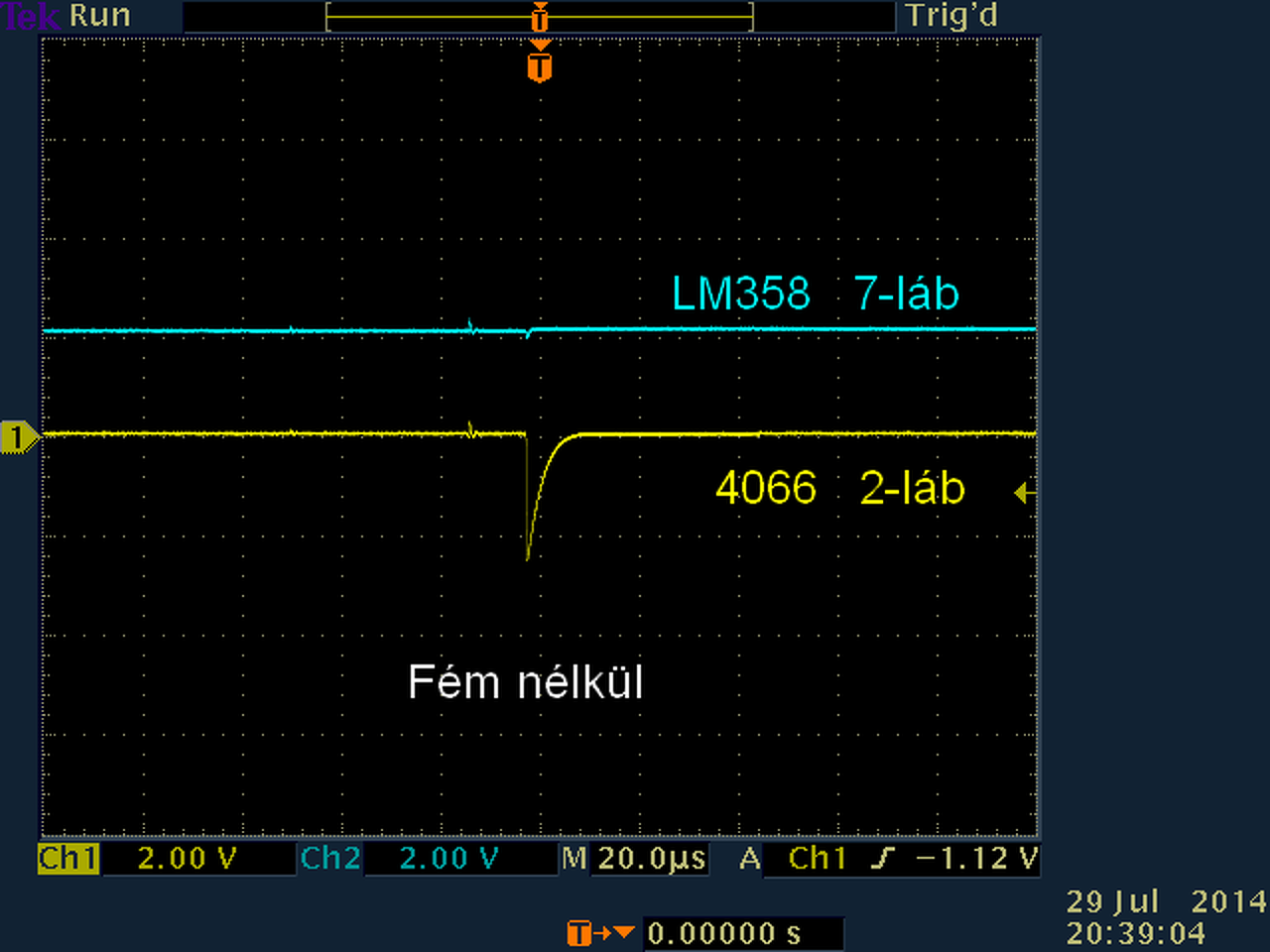 Az 555 3.lábán jó, 4066 2. láb a jelalak stimmel, bár halványan látszódik(Delayra nem változott), Ne5534 6.lábán sikerült megkapni azt a jelet, még látni is lehetett, hogy mit ér az R6-os sönt ellenállás változtatása. Az LM 358 5-ös és 7-es lábak jelei vas nélkül megeggyeztek a tieddel, de vassal a jelalak olyan lett a 7-es lábon, mit a 4066 2.lábán vas nélkül, csak az alapvonal nem 0V-on, hanem 0,7V-ra felment, de alakra úgy nézett ki.
