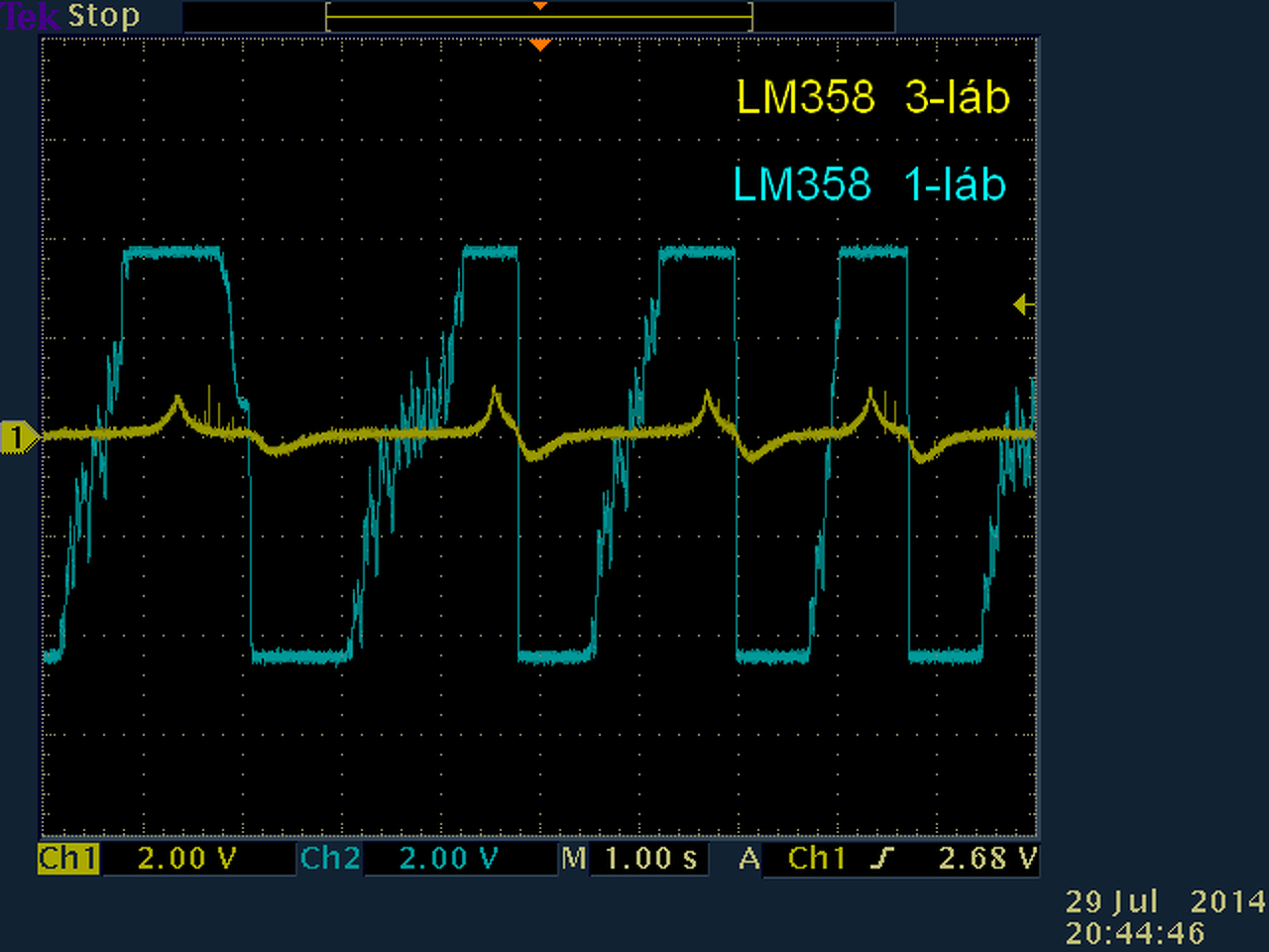 LM358 5, 6, 7 lábak. Az 5-ös lábon tiszta a jel, de a 6-7-en meg kissé ugrált.
