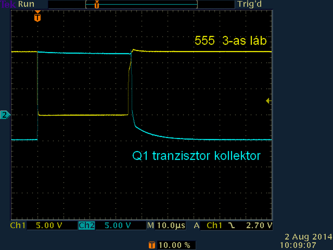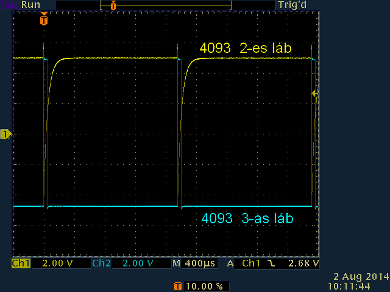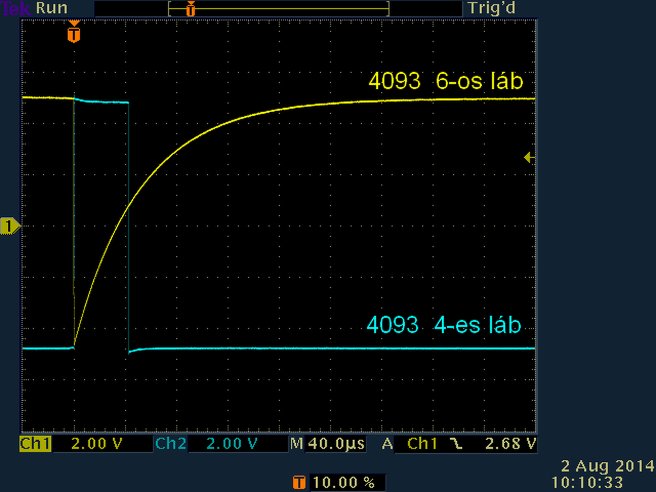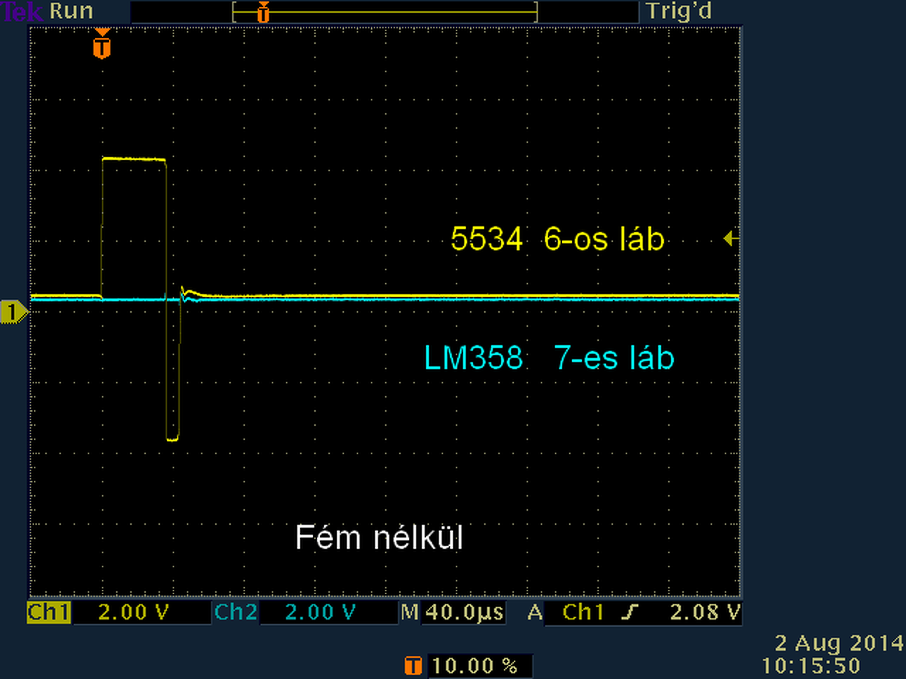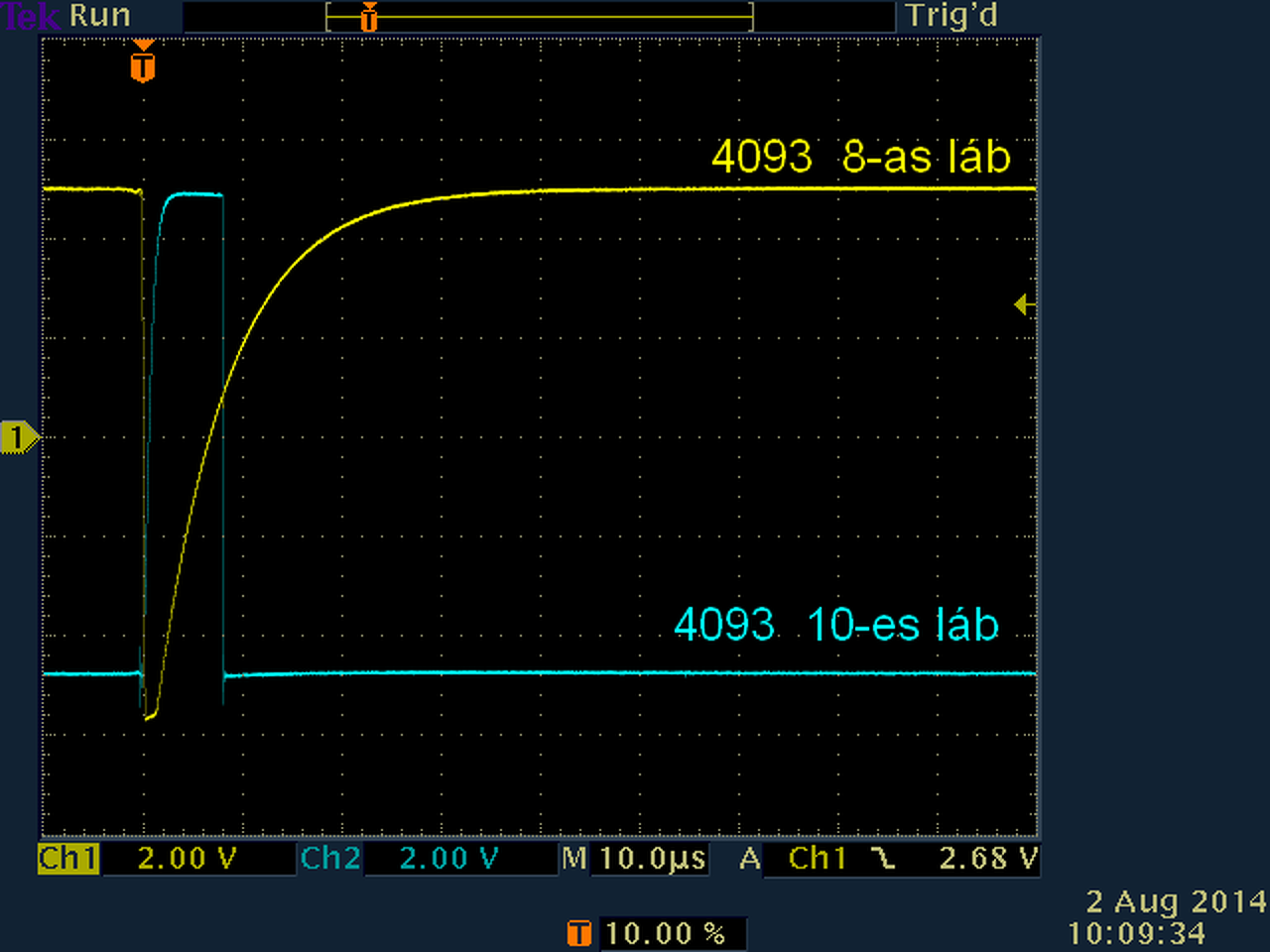 10.png képen lévő jeleket nézd, ez vezérli 4093-at. Q1 tranzisztor kollektorán a jel alsó-felső szintjei megfelelők legyenek. A 4066 2-es láb fémre először csak a jelalakot adja 0V szinten, fém közelítve elindul lefelé a teljes szint, azaz egyenszintje is. Delayre úgy reagál, hogy a 4066 2-es lábon figyelve, delayt tekergetve, 4066 2-es lábon megjelenik 0V-ról negatívba menő tüske. Tehát poti egyik végén csak egyenes 0V vonal, poti tekerve tüske lefelé megjelenik, egyre nagyobb csak lefelé nől. Ahogy a kapujel kiválasztja előző válaszom 0.png képen. A 4093 3-as lábon rövid tüskék vannak -15.png-, talán csak nehezen látszik szkópodon, mert ez valószinűleg halványan jelenik meg. Szkópon trigger beállítása jó-e. R6-al ráérsz akkor foglalkozni, ha már rendben működik. A hozzászólás módosítva: Aug 2, 2014