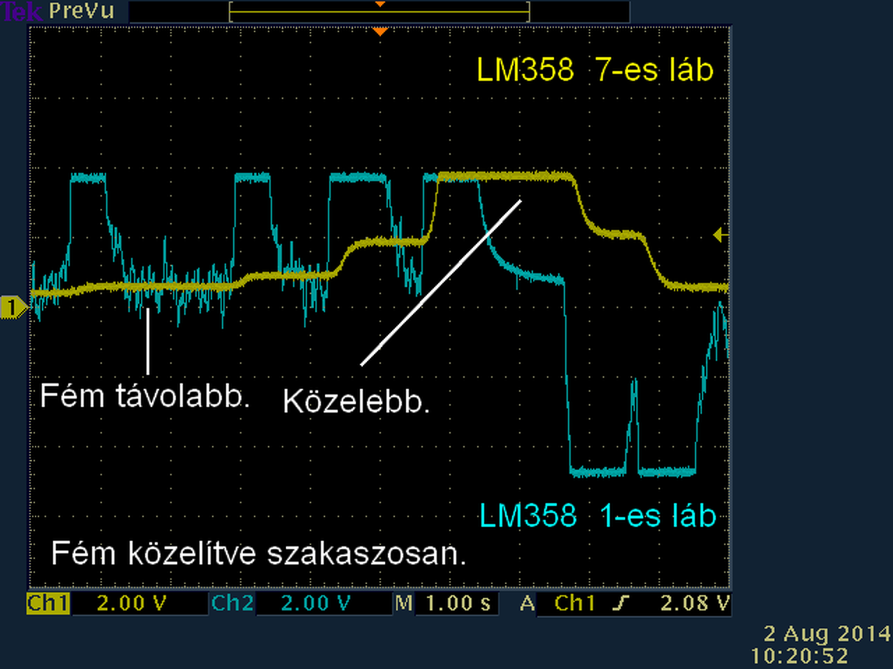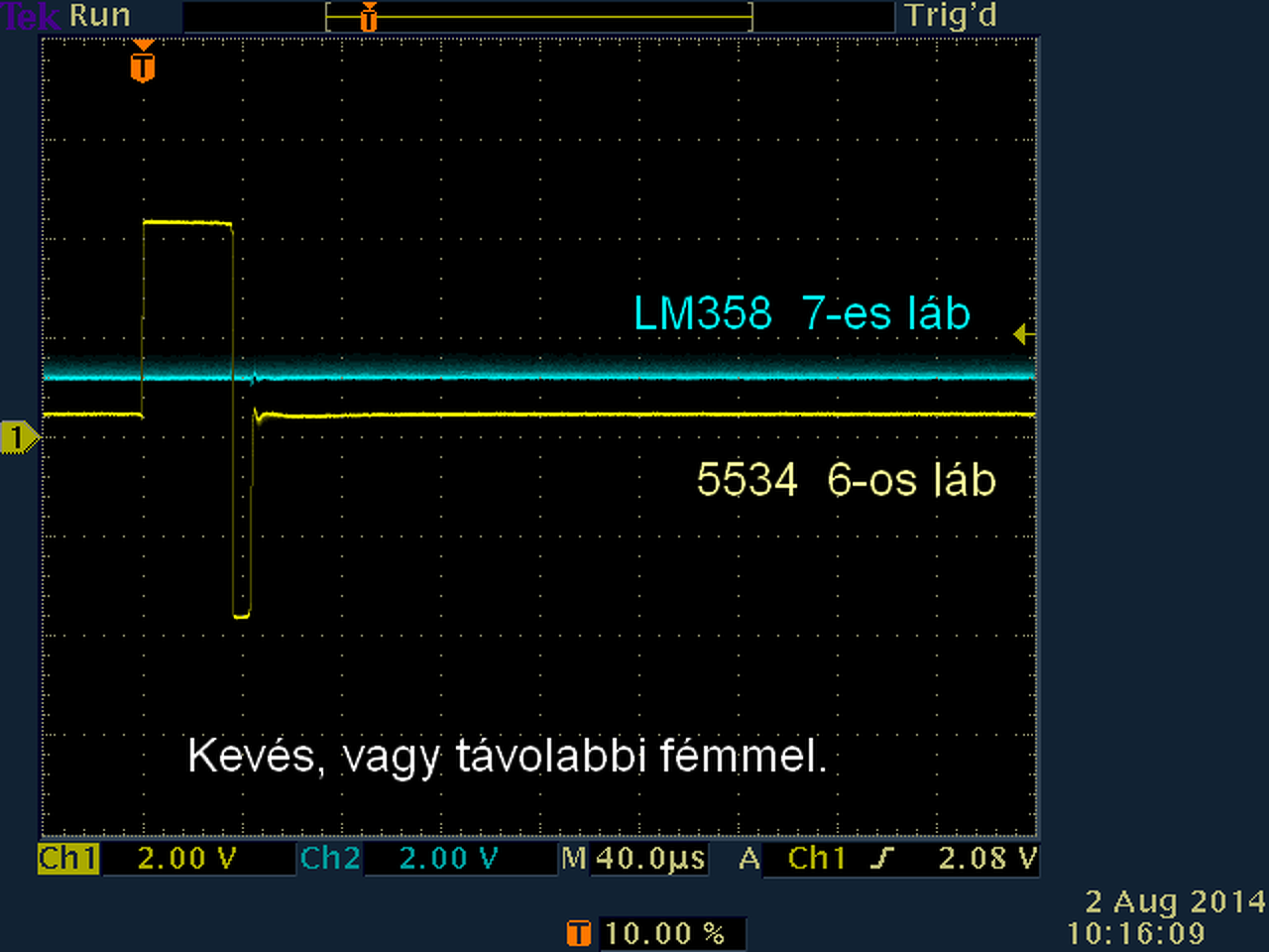 Innentől a finomhangolás már a pld: 20Ft.-ossal mehet. A "delay" beállítása -sokat számít- ahol a legtávolabbról érzékel. Tekerccsel is lehet variálni, de ekkor ajánlatos szkóppal NE5534 6-os lábán a csillapítást figyelni, és -ha kell- R6 ellenállást utánállítani. Illetve lehet kissé csillapítatlanabb beállítással is próbálkozni, R6 változtatással. A csillapított beállítás ami 0.png képen van, 2-vel előző hozzászólásomnál. Csillapítatlan, amikor a 0.png képen a kék felfutó éle utáni sárga is tüskeszerűen felmegy a +5V felé. A "gain" állítása -jobb kivezetett potméter-, ahol még zajból kivehető a fém jelzése. Treshold, hogy mennyi ideig tartson a jelzés fém érzékeléskor. Nem sok hatása van.