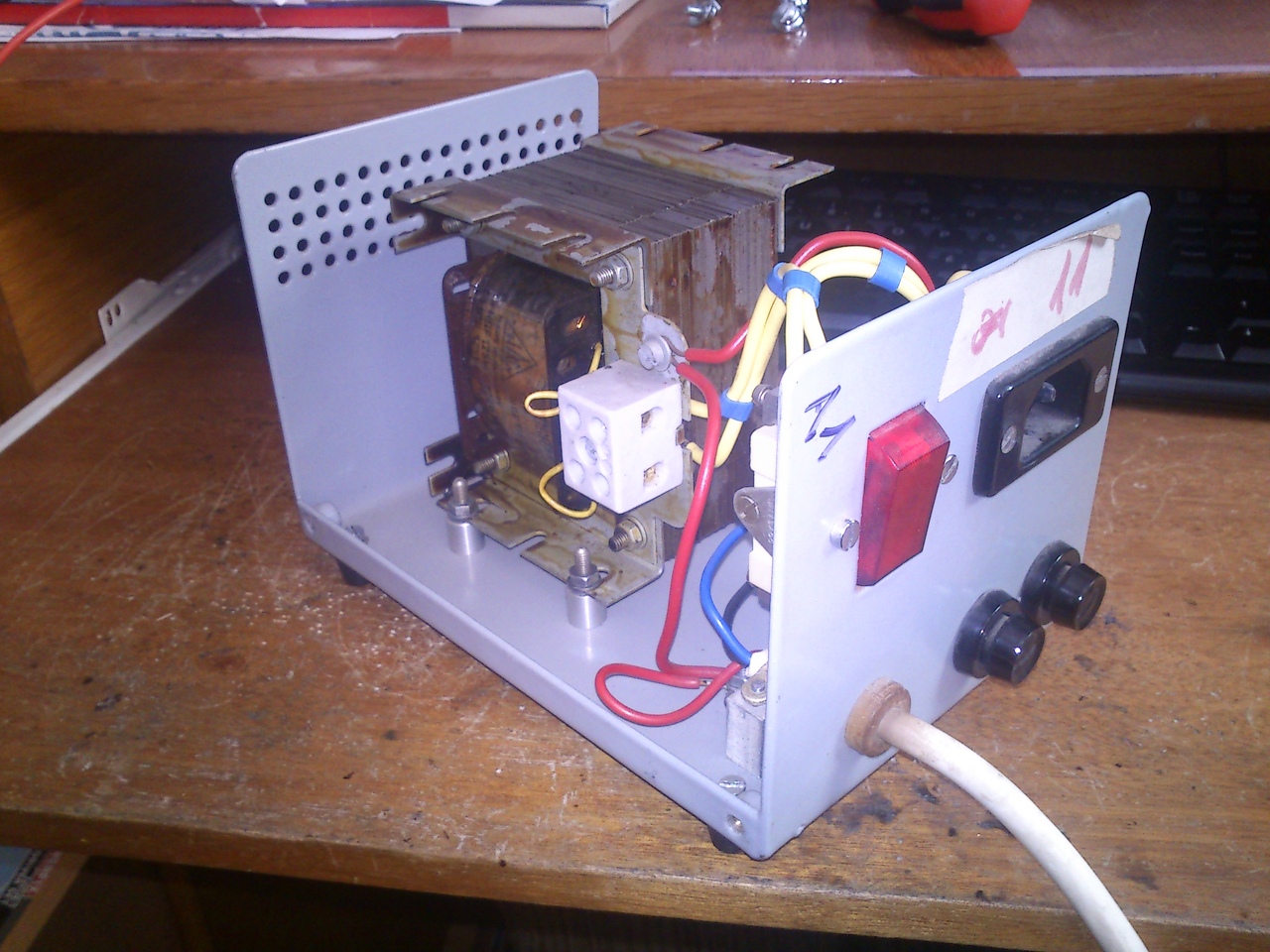 Üdv mindenkinek! Hozzám került egy ilyen "kütyü", viszont nem tudom mire használták. Van benne egy nagy lemezelt trafó, vagyis inkább tekercs, mivel csak 2 kivezetése van kb 5ohmos ellenállással. A tápcsatlakozó egyik ága közvetlen a kimenő vezetéken van, a másik ága pedig a kapcsolón és biztosítékon át jut a kimenetre. Valaki tudja mi lenne ez? De méginkább: most mire használható ez a "trafó"?