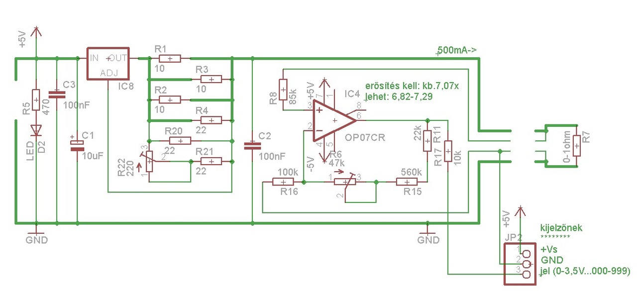 Kicsit tovább haladtam a kapcsolással. A műszer kalibrálásának lépéseit így gondolom: 1) Az R22-es potival a pontos 500mA-t beállítom, 2) A kimenetekre pontos 0.5V-ot vezetek, R6-tal beállítom, hogy a kijelző 999-et mutasson, 3) ellenőrzés: ha összezárom a kimenet vezetékét ott, ahol a visszavezető vezeték van, nullát kell mutatnia a kijelzőnek. 4) A krokodil csipesznek lesz még ellenállása, ezt ki kellene offsettel kompenzálni a műveleti erősítőnél. Amivel még ki van egészítve a kapcsolás: LED jelzi, ha az áram lecsökken 495mA alá (LM317 melegszik, akkor a ref. fesz. csökken), vagy az ellenállás nagyobb, mint 6ohm, ekkor nem tud 500mA folyni). Mit gondoltok erről a kapcsolásról? A kalibrálás lépési jók? Köszönöm!