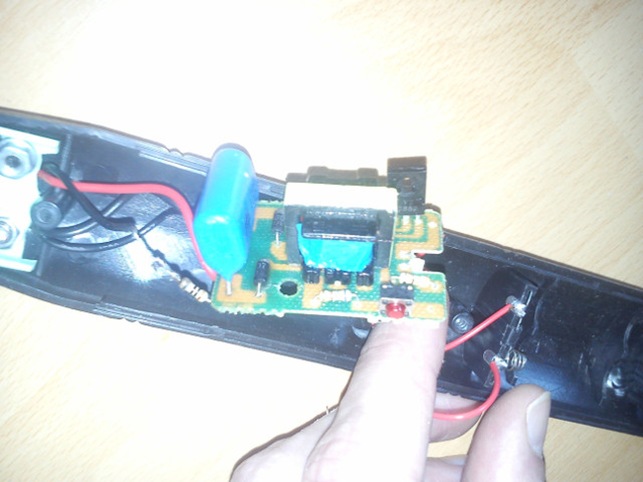 A minap vettem egy elektromos rovarölőt nagyon kedvező áron. Kapásból szétrobbantottam, mert a gyári kábel kevés volt. Még szerencse, hogy szétszedtem, mert a hálózati csatlakozás ki volt esve, elengedte a forrasztás. Lefényképeztem, ha már úgy is szét van szedve. Nincs agyonbonyolítva, de most se időm se kedvem nem volt visszarajzolni. Felteszem a képeket, aztán ha úgy van időm és kedvem, akkor visszarajzolom a kapcsolást.