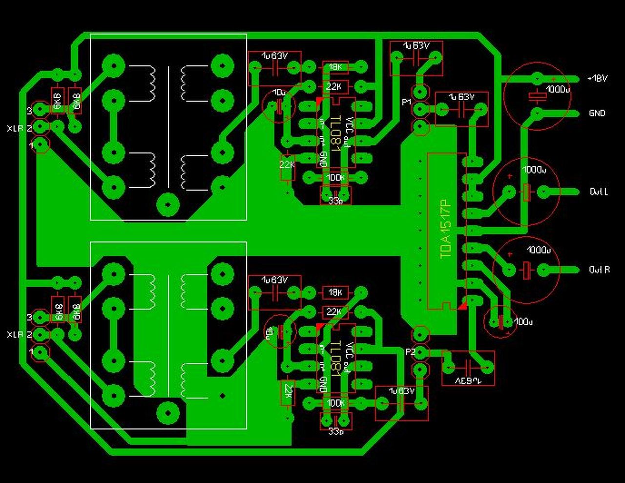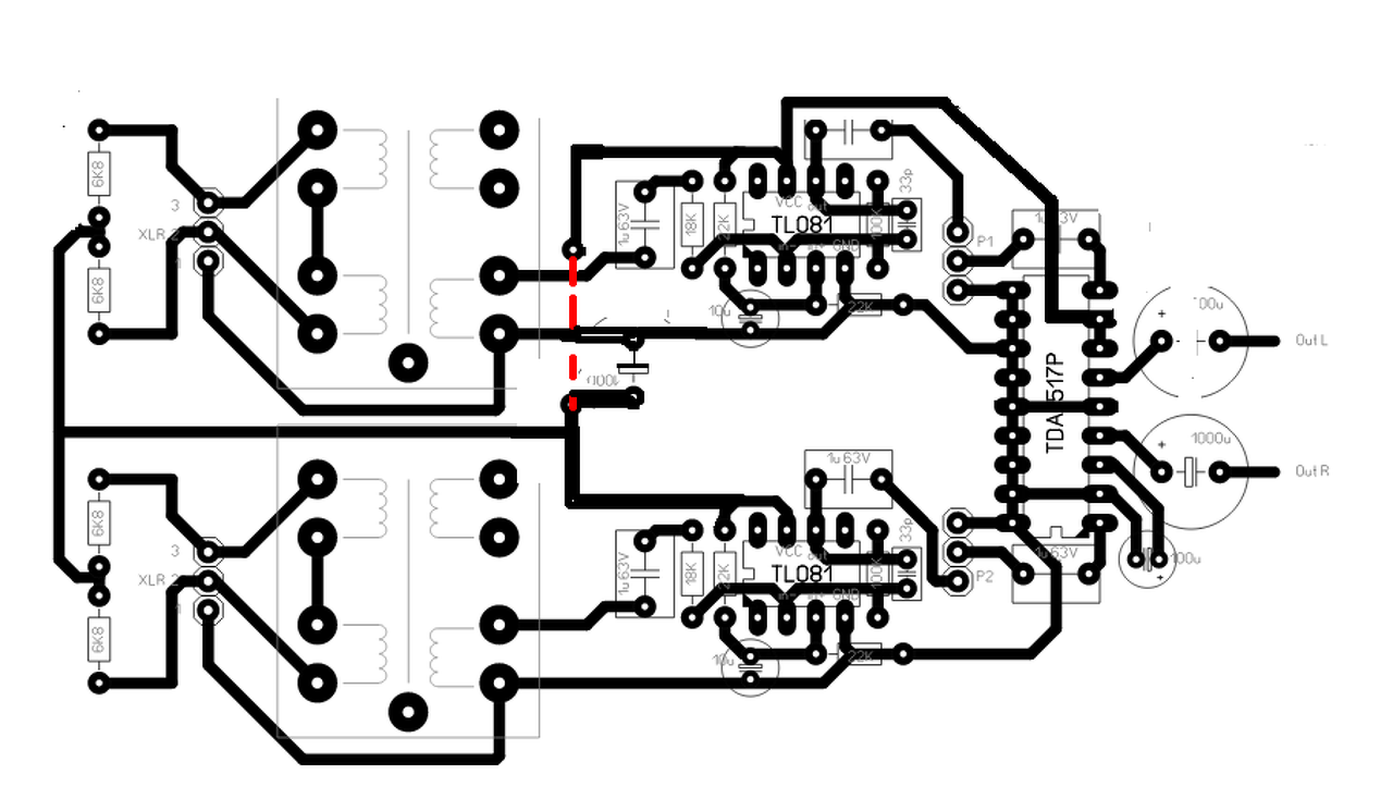Mint említettem teljesen máshogy tervezném, de ha marad így, akkor is a csillagpontos földelésre törekedj. Földhurok a bemeneti csatik földpontjai zárásával is létrejöhet, ezért alakítottam a terveden, de még sokat lehetne javítani rajta.