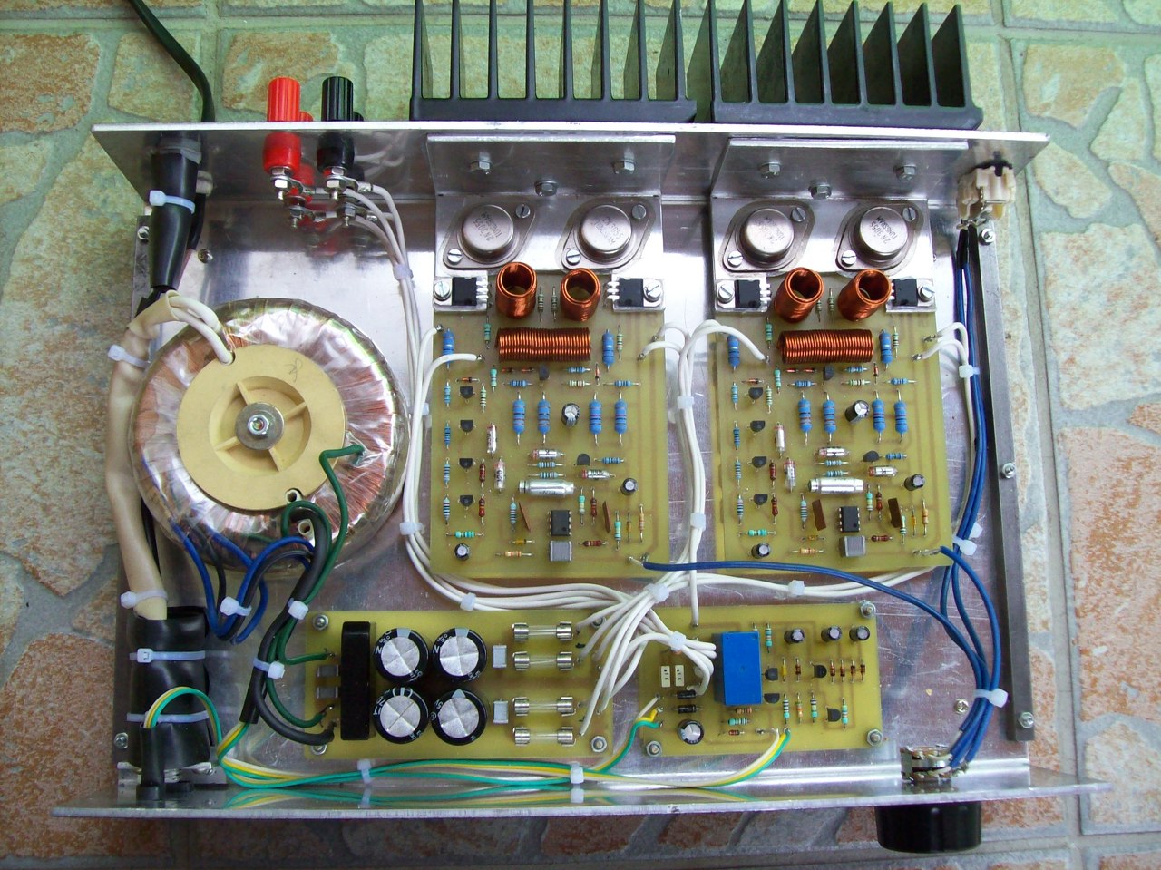 Hölgyeim és uraim, íme egy jó példa a korrekt erősítő dobozlásra, itt nem a legérzékenyebb részek vannak "rátekerve" a hálózati trafóra, hanem szépen a lehető legtávolabbi ponton vannak a bemenetek, így kell ezt csinálni! Ha lenne egy árnyékoló lemez a trafó és a végpanel között, referencia lehetene.