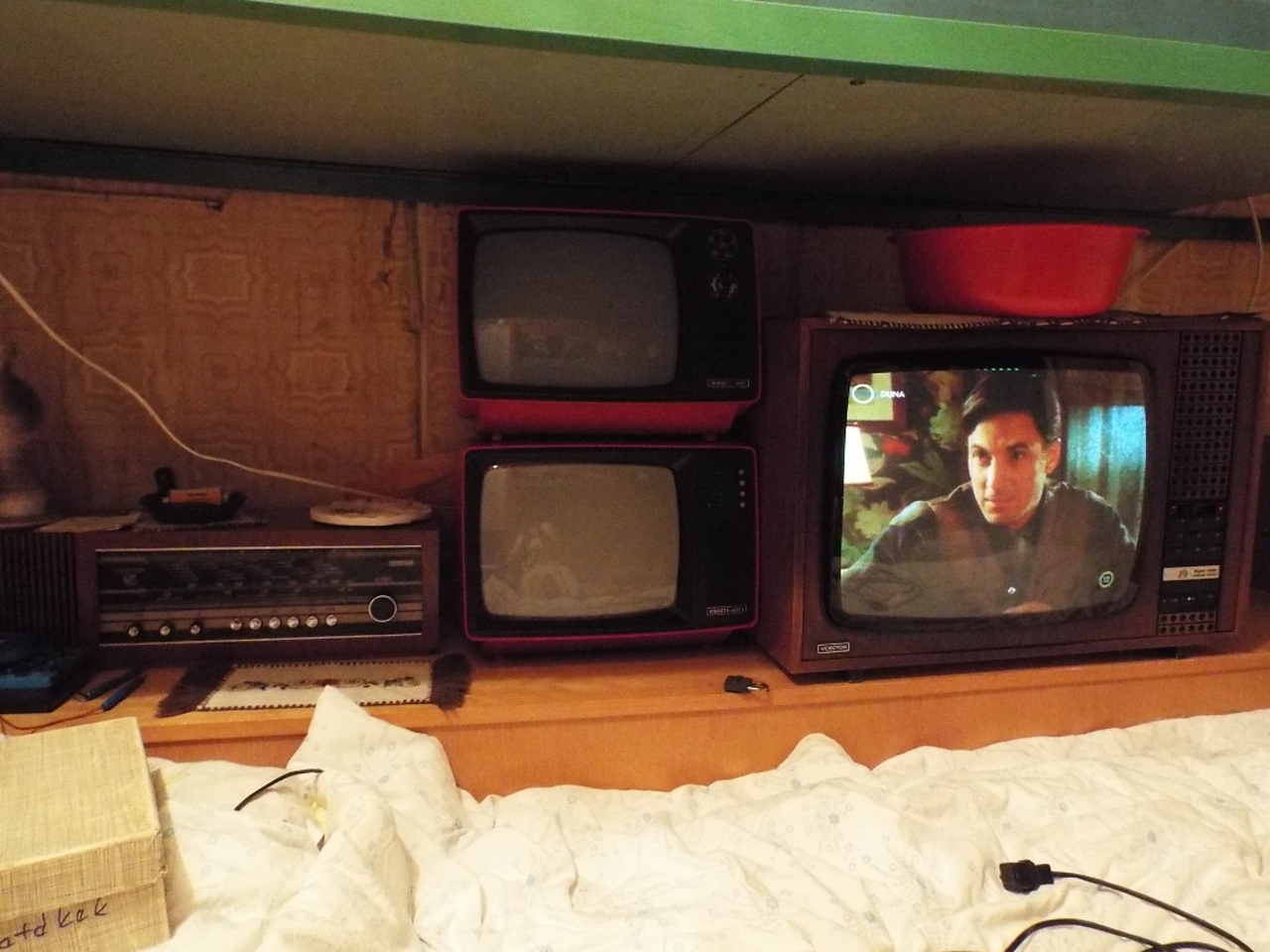 Egy kis retro. A balatoni telken van egy melléképület, ami évekig tároló volt, most ide került egy csomó régi cucc. A konnektor a nyáron került fel. Az itt levő dolgok 100%-a bontott, és minimum 30 évvel ezelőtti. A konnektorok, a lámpa, és a vezetékek is. (A szabványokat most hagyjuk.) A TV, a rádió, mind működik.