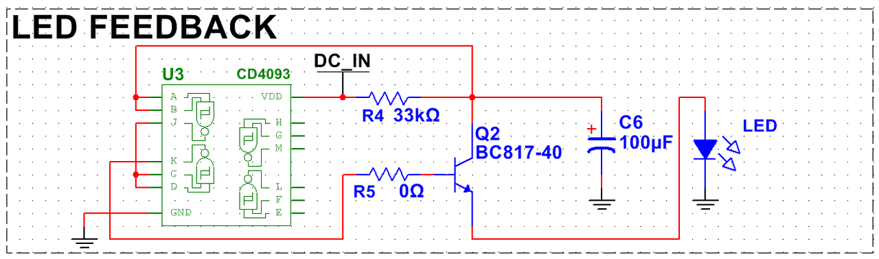 Egy kis fogyasztású LED-villanót szeretnék építeni (ritkán villanjon egy nagyot). Kaptam javaslatot egy kapcsolásra, amit megépítettem (alább csatolom). Ez ugye úgy működik, hogy töltöget egy kondit egy ellenálláson keresztül, és ha a feszültség elér egy szintet, a tranzisztort nyitja a shcmitt-trigger, és villan egyet a LED (visszaejtve ezzel a feszültséget a kondenzátoron), majd így tovább előről. A kérdésem az, hogy szerintetek miét van az, hogy DC_IN=6.3V alatt a LED folyamatosan világít? Felette működik a dolog... elvileg CD4093 egy CMOS IC és 3V felett már muzsikálnia kellene... Köszönöm!