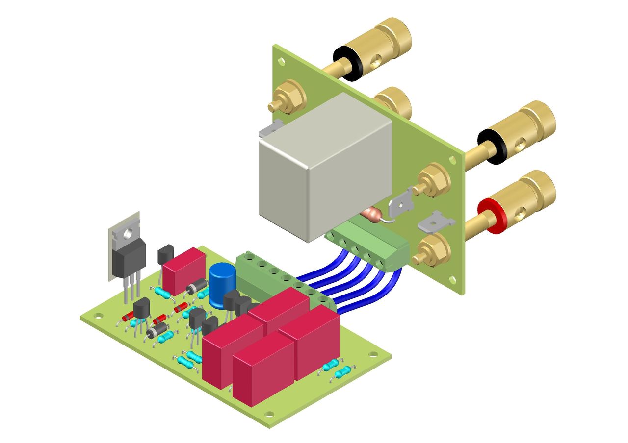 A kapcsoláshoz a szerző saját panelterve nem érhető el, de egy fórumozó jóvoltából van egy letölthető lehetőség a hivatkozott linken is. Ezt Én most szeretném kiegészíteni egy másikkal, ami valójában 3 kombináció egy alapgondolatra. Az eredeti rajzhoz képest csak annyi változás van, hogy állapotjelző LED-eket is kapott a terv (ezt Reloop-nak köszönjük). A v1.1 és a v2.1 változat kétpaneles, ami azért lehet jó, mert változatos elhelyezést tesz lehetővé, illetve nagyon változatos lehet a reléválasztásunk, mert ehhez csak az egyik panelt kell módosítani. A két változatból az első huzalozott hangszóró csatlakozást tesz lehetővé, a második pedig közvetlenül a kimeneti csatlakozóra illeszkedik, ami az elektromos kötést és a mechanikai tartást is megoldja. A v3.1 változat szintén ugyanarra az alapgondolatra épül, de egypaneles megoldást kínál. Minden változat a nekem szimpatikus SZL RY relésorozat, két érintkezős típusára van optimalizálva. A terveket próbáltam térben is ábrázolni, amivel igyekszem ötleteket adni a kivitelezés szerintem követendő példáira. Egyik tervet sem próbáltam ki. Azokban lehet elírás, elkötés, ezért mindenképpen célszerű az építés előtt átnézni őket.